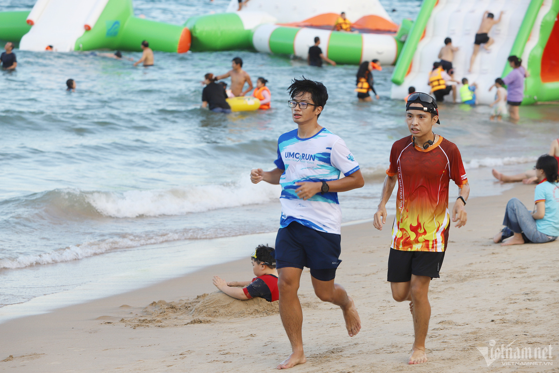 Chiều 29/4, người dân, du khách đổ về bãi biển đường Trần Phú vui chơi, tắm giải nhiệt trong tiết trời nắng nóng. Bãi biển dọc đường Trần Phú, đoạn kéo dài hơn 5km chật kín người.