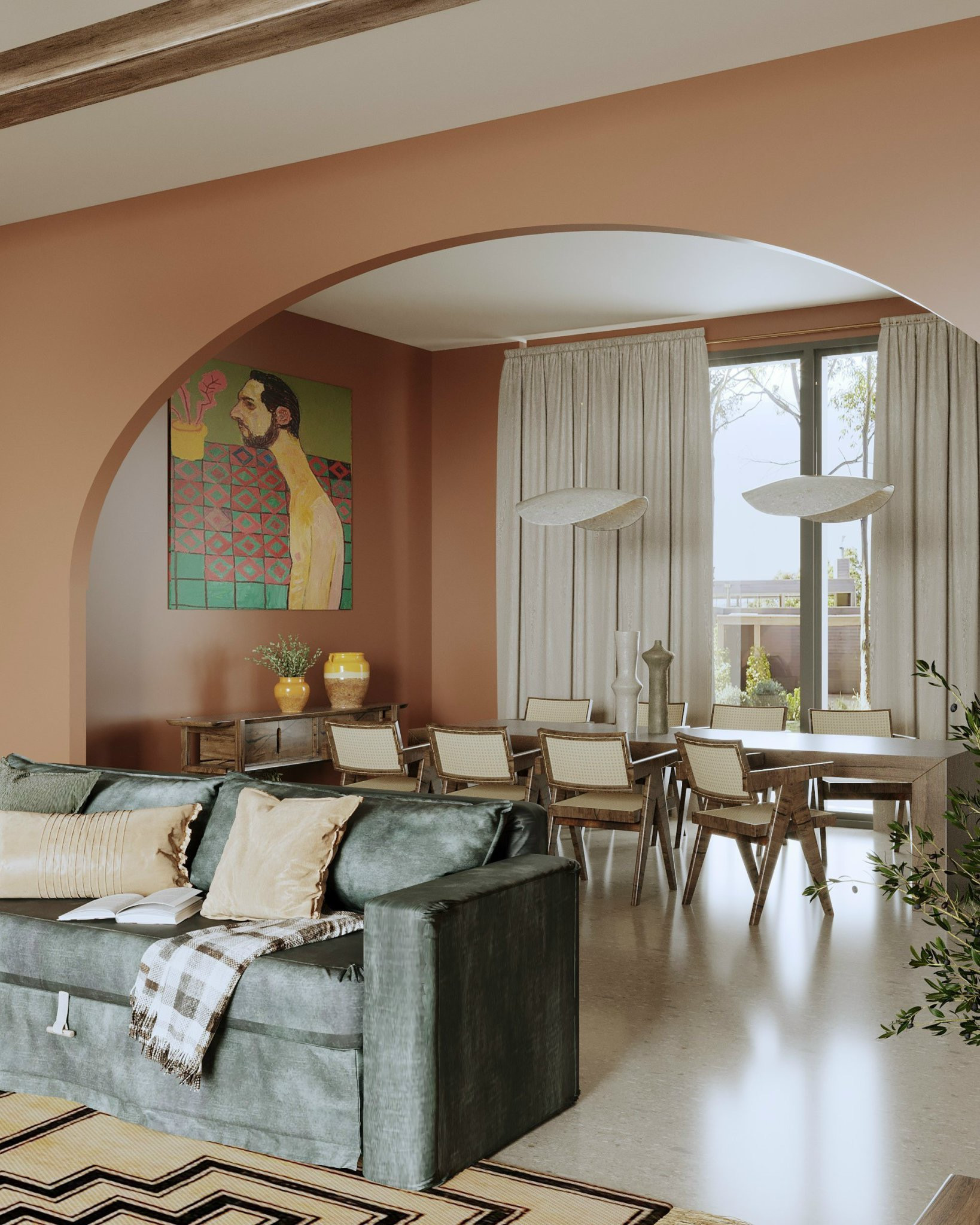 Tổng thể biệt thự có 3 khối nhà, mỗi khối mang màu sắc khác nhau như: Xanh cốm, cam đất, hồng.