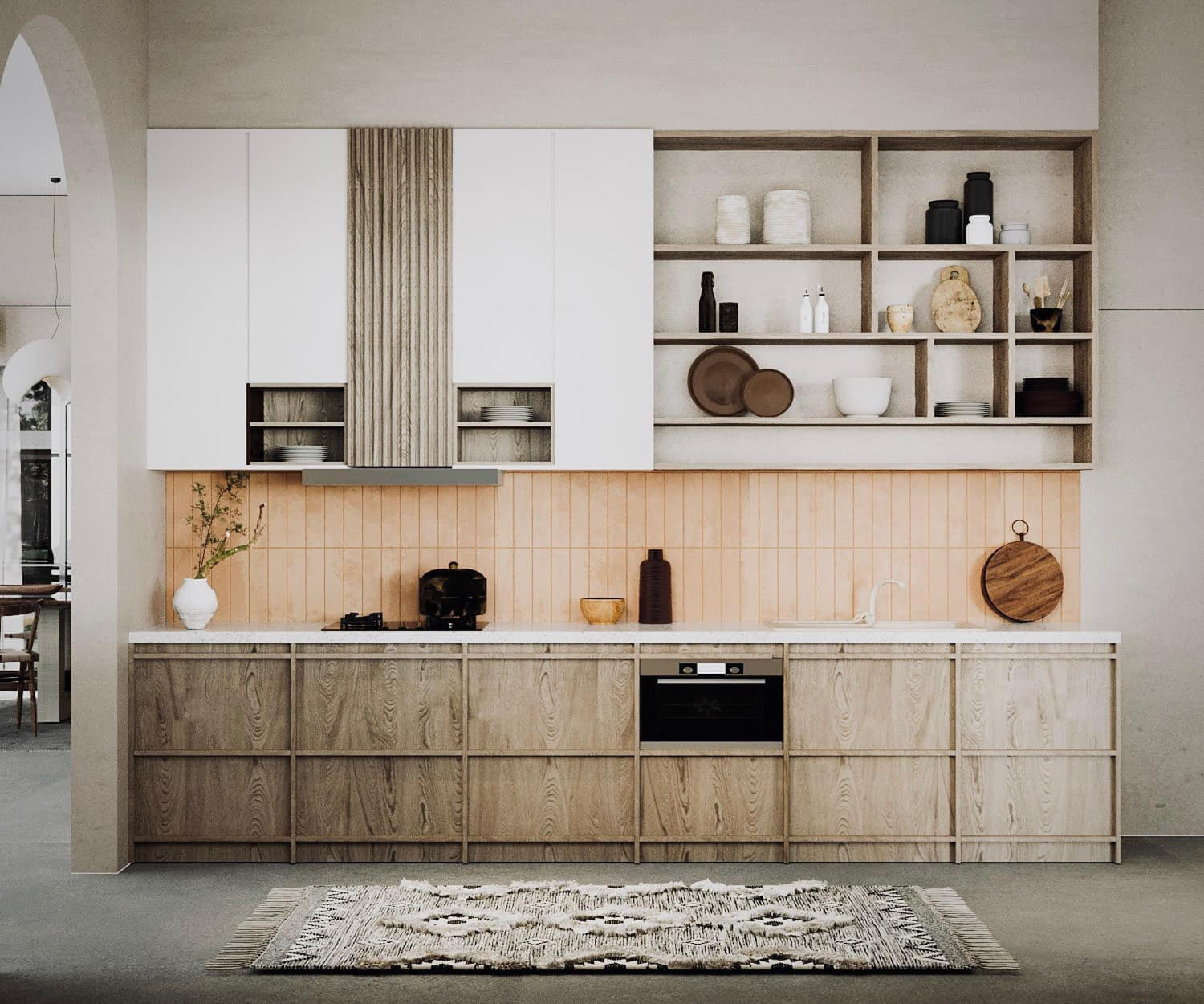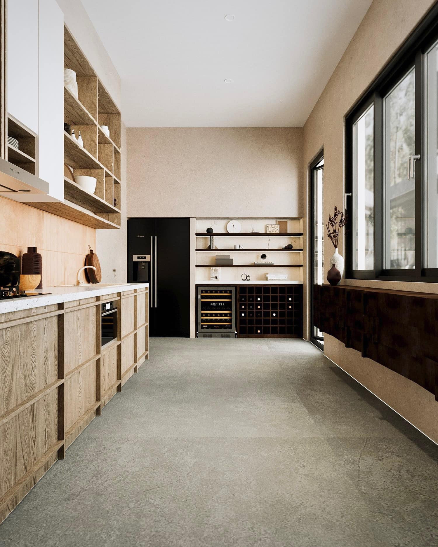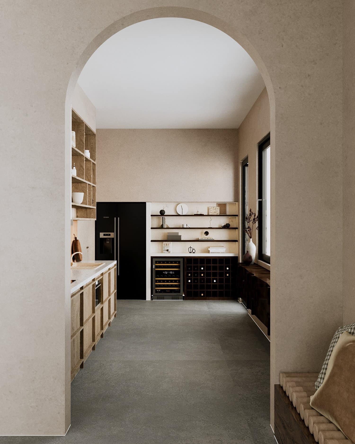 Sàn bếp ốp gạch màu ghi sạch sẽ. Không gian bếp thông với phòng khách qua cửa vòm. Phòng nhìn ra vườn nên luôn nhiều ánh sáng, khô ráo.