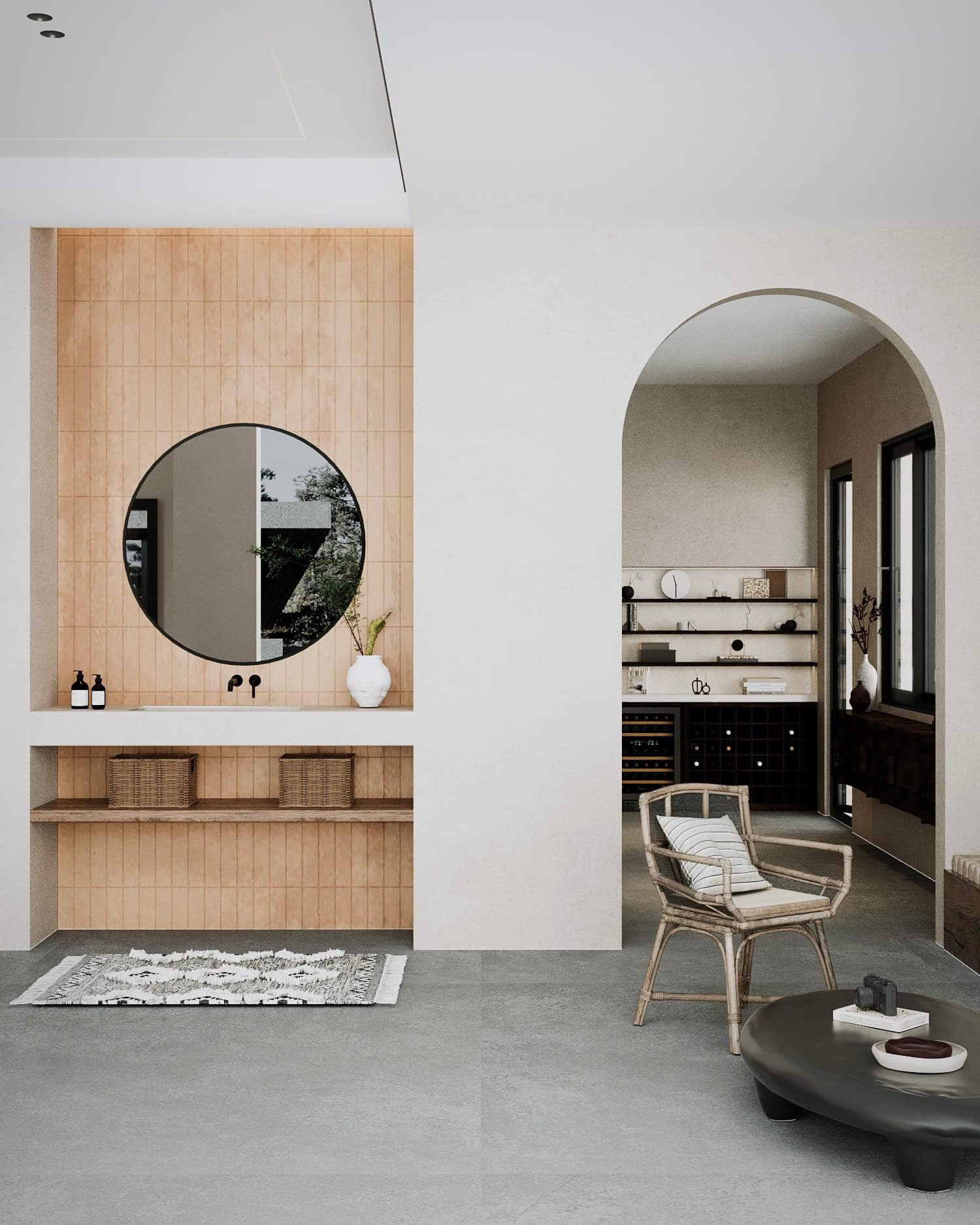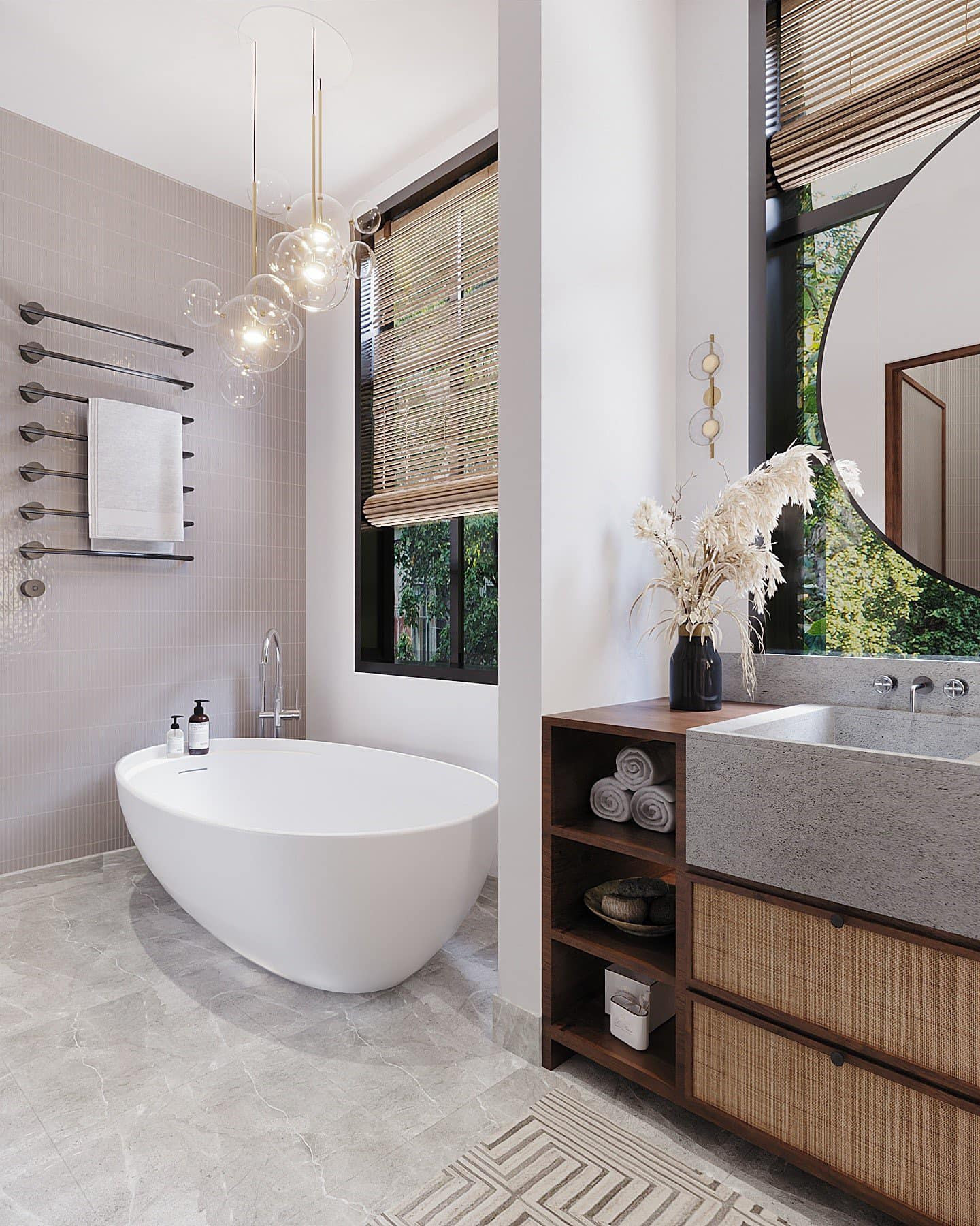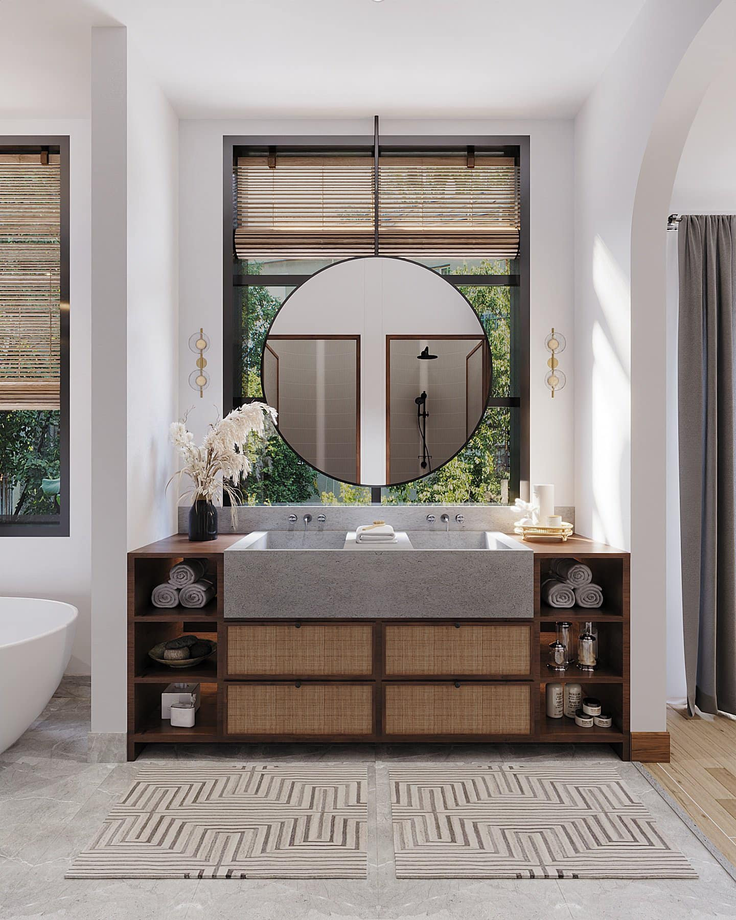 Phòng tắm nghỉ dưỡng hướng sân vườn. Bồn rửa mặt bê-tông dẻo phối với tủ gỗ có cánh đan mây mắt cáo cổ điển. Sự phối trộn các vật liệu, các phong cách rất tinh tế.