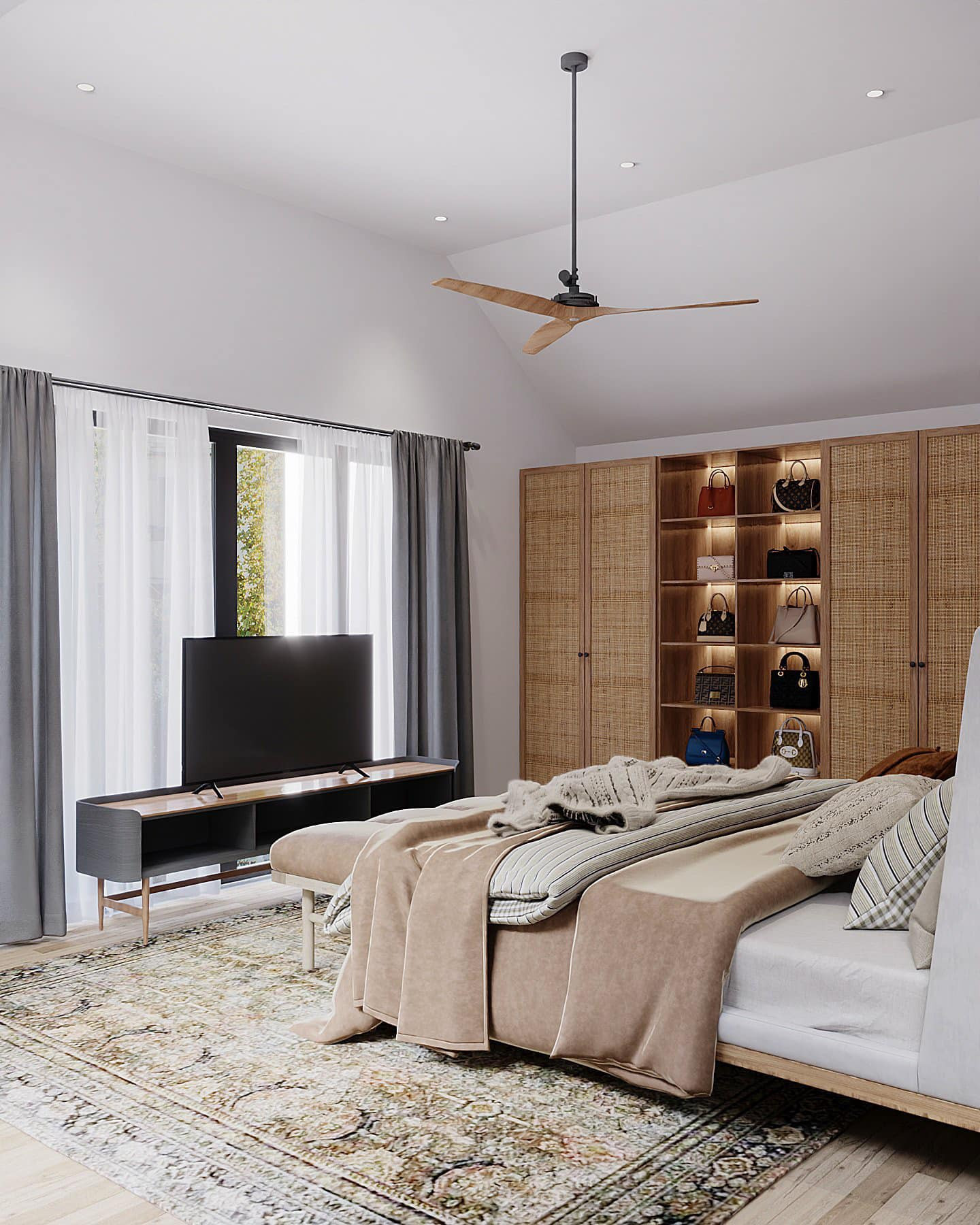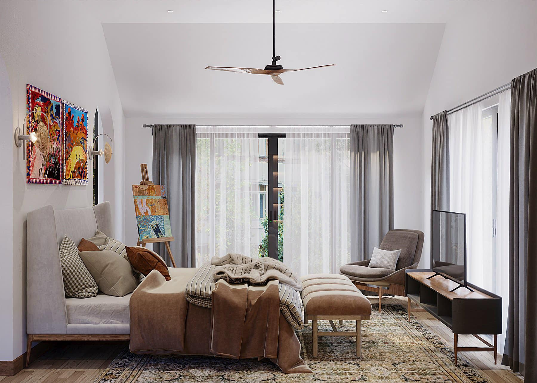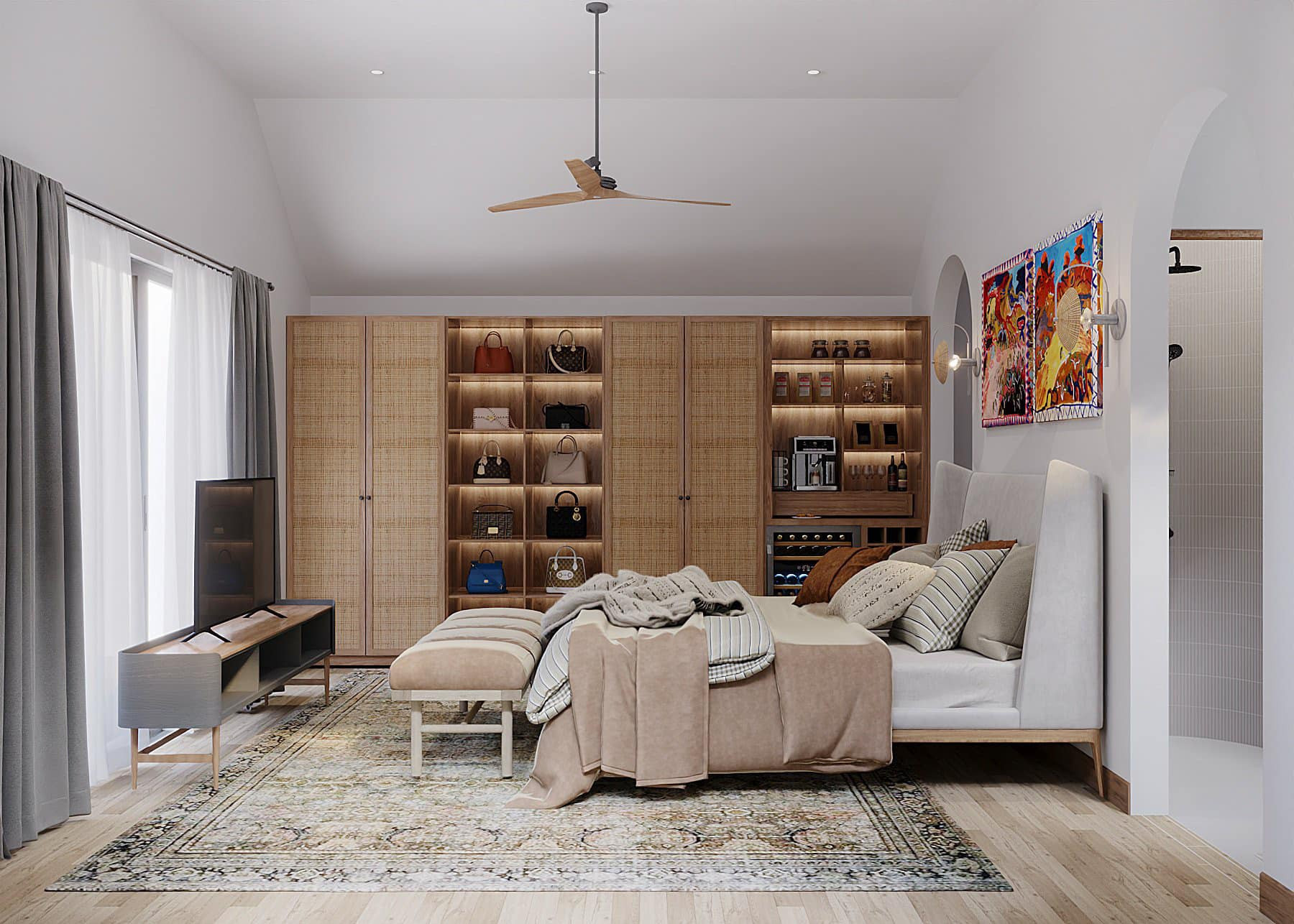 Phòng ngủ master của bố mẹ có khoang tủ rộng, kịch trần kết hợp kệ trưng bày túi xách. Những bức tranh nghệ thuật, đầy màu sắc nổi bật trên sắc trắng của không gian.
