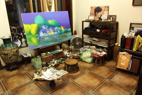 Góc sáng tác của họa sĩ Đào Hải Phong chỉ vỏn vẹn có vài mét vuông.