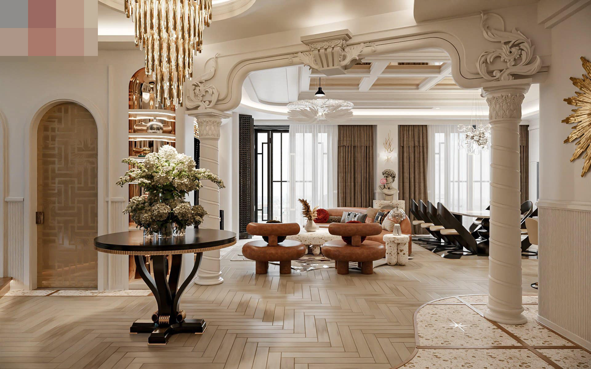 Bếp và phòng khách thông suốt theo không gian mở, gia chủ có thể tổ chức những bữa tiệc lớn tại đây. Hệ thống ánh sáng ấm áp, tinh tế hơn nhờ đèn chùm đủ kiểu dáng.