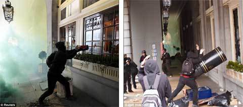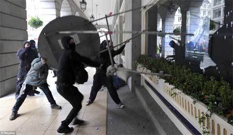đập phá cửa sổ của các cửa hiệu gần điểm mốc du lịch nổi tiếng như Quảng trường