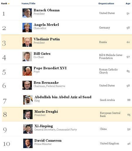 Vẫn đảm trách cương vị chủ tịch của Microsoft nhưng tập trung nhiều hơn vào những nỗ lực từ thiện của ông, Bill Gates là gương mặt "khoa học công nghệ" duy nhất đứng trong Top 10 quyền lực, với xung quanh toàn là các chính trị gia.