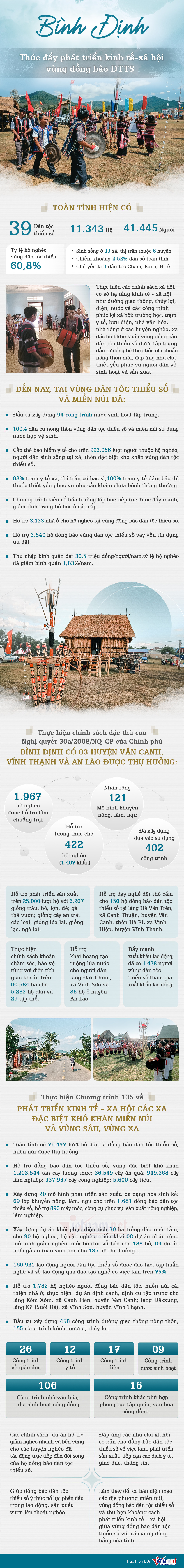 Tại Bình Định, cơ sở hạ tầng KT-XH như đường giao thông, thủy lợi, điện, nước và các công trình phúc lợi xã hội: trường học, trạm y tế, bưu điện, nhà văn hóa, nhà rông ở các huyện nghèo, xã đặc biệt khó khăn vùng đồng bào DTTS được đầu tư đồng bộ.