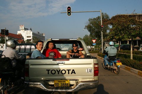| Ở Viêng Chăn cũng như trên khắp nước Lào ô tô tải cũng như bán tải thoải mái chở người trên thùng xe. |