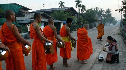 | Từng đoàn nhà sư khất thực vào mỗi buổi sáng sớm là nét văn hóa độc đáo ở Viêng Chăn. |