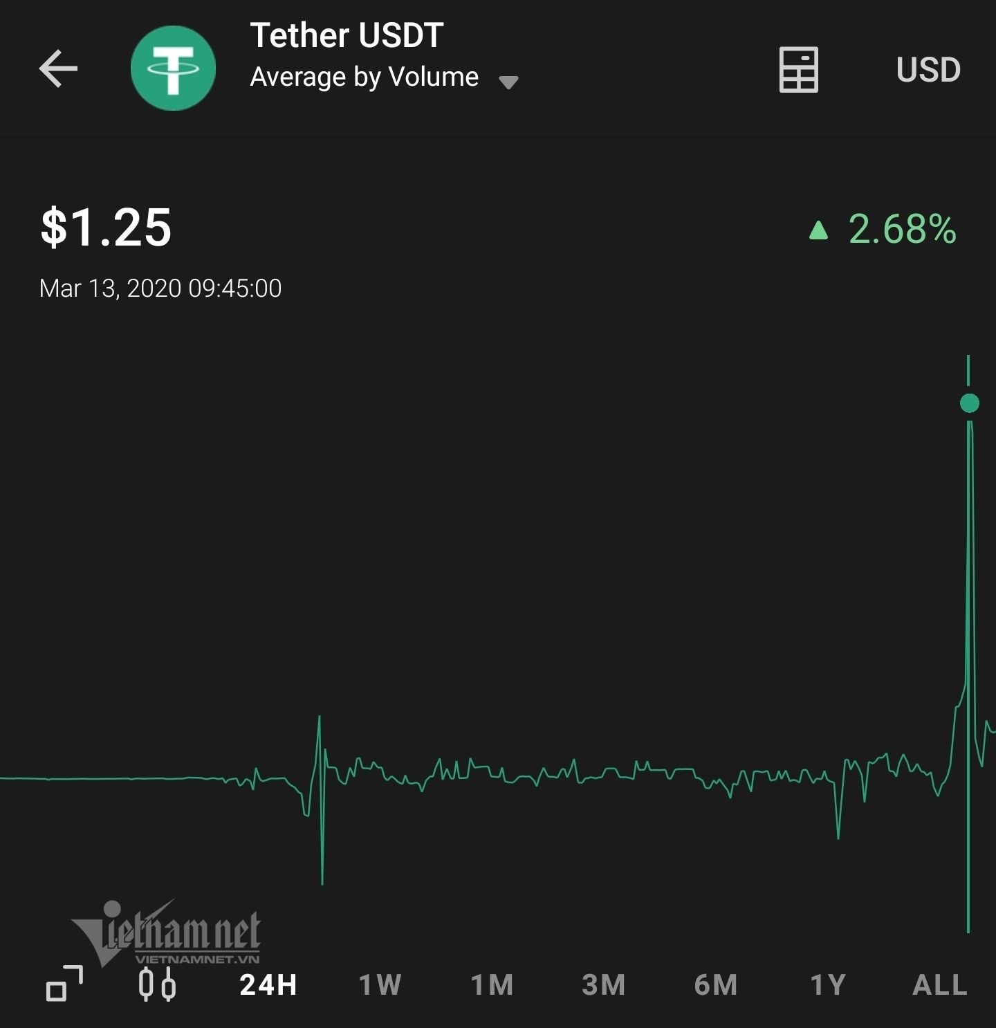 | Để tránh bão, các nhà đầu tư thường "trú ẩn" vào đồng USDT. Đây cũng là lý do mà giá của USDT có thời điểm lên tới 1,25 USD dù giá của đồng tiền ảo này thường chỉ dao động quanh mức 1 USD. |