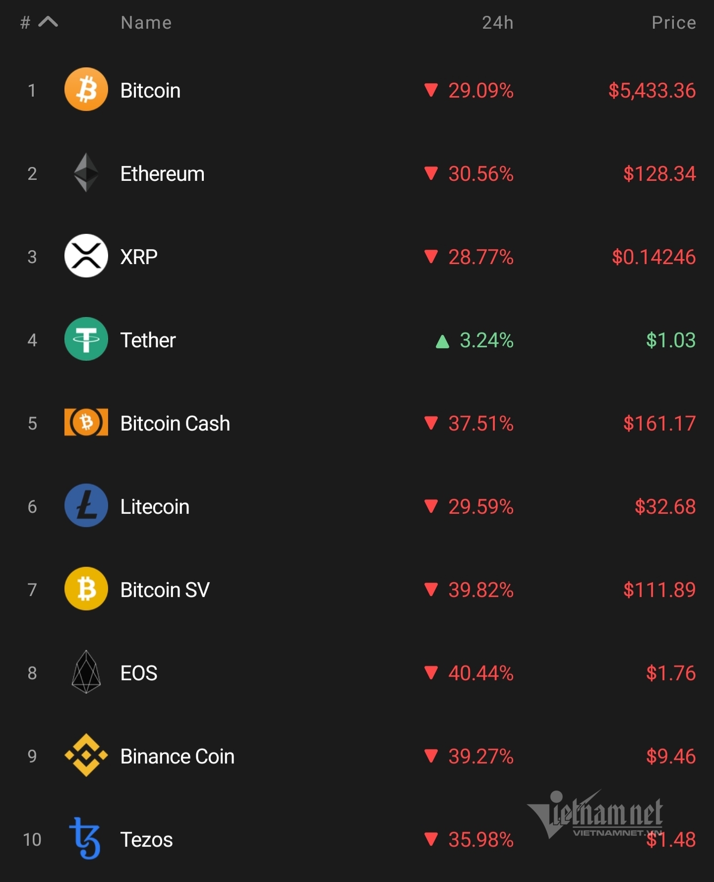 Nhìn chung, việc giảm giá sập sàn là tình cảnh chung của thị trường tiền ảo. Chỉ có duy nhất đồng tiền ảo Tether (USDT) thoát khỏi tình trạng này, thậm chí giá Tether còn tăng khoảng 3% so với ngày hôm trước.
