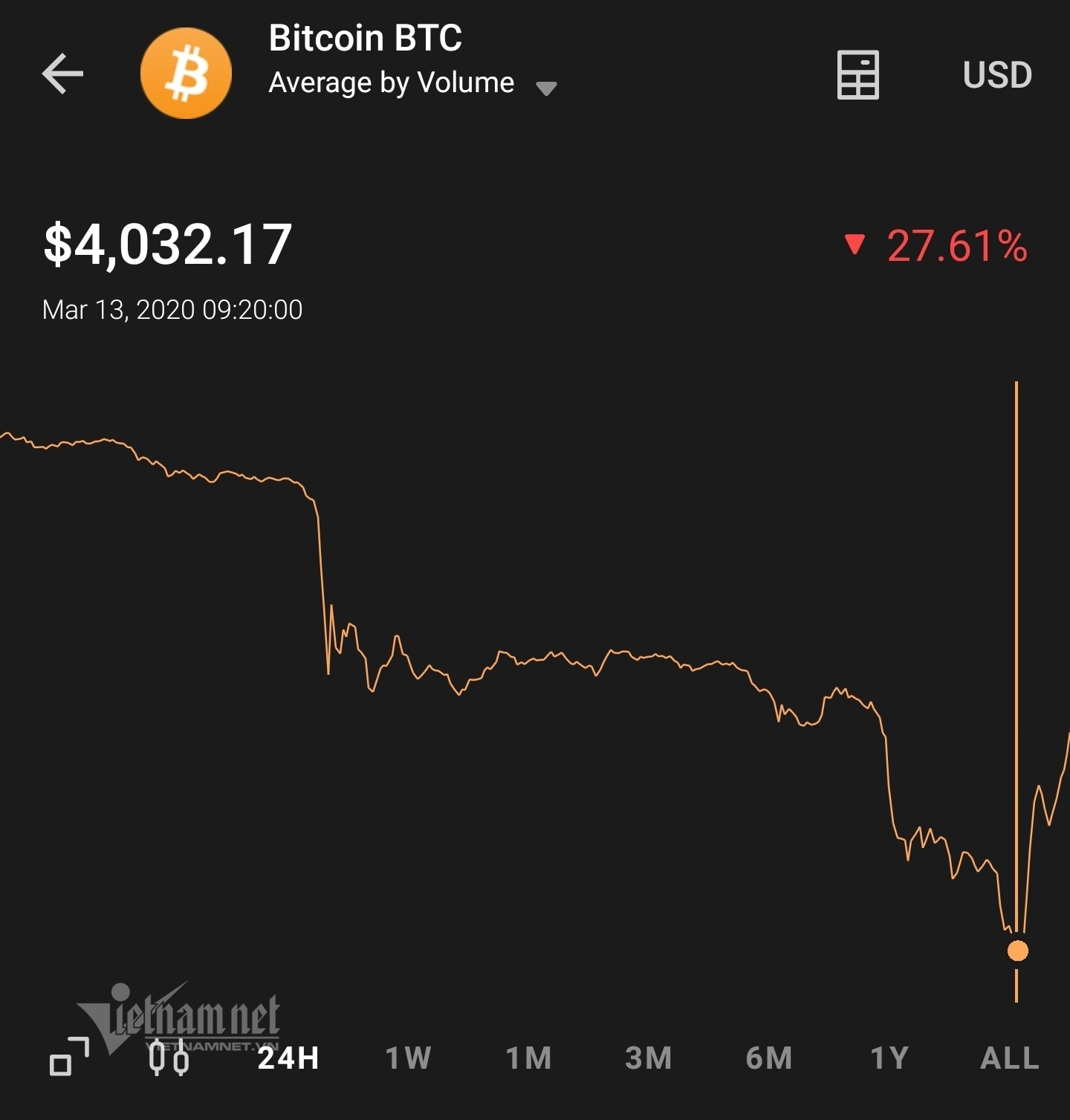 Theo ghi nhận của Pv. VietNamNet, tại thời 9h15’ sáng ngày 13/3, giá Bitcoin chỉ còn giữ ở mức 4.032 USD. Mức giá này chỉ bằng một nửa so với giá Bitcoin chỉ một ngày trước đó.