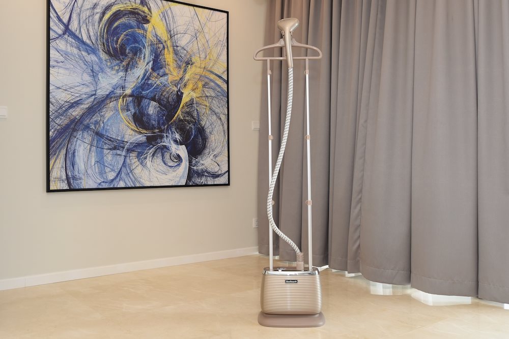 Với thiết kế dạng đứng, chiếc bàn ủi nhỏ gọn, thanh lịch. Nó cũng có bộ phụ kiện đa dạng gồm móc treo kèm kẹp, găng tay cách nhiệt, bàn chải vải, dụng cụ ủi ly, miếng đệm ủi. Bảng điều khiển của sản phẩm được thể hiện bằng tiếng Việt, dễ dàng sử dụng.