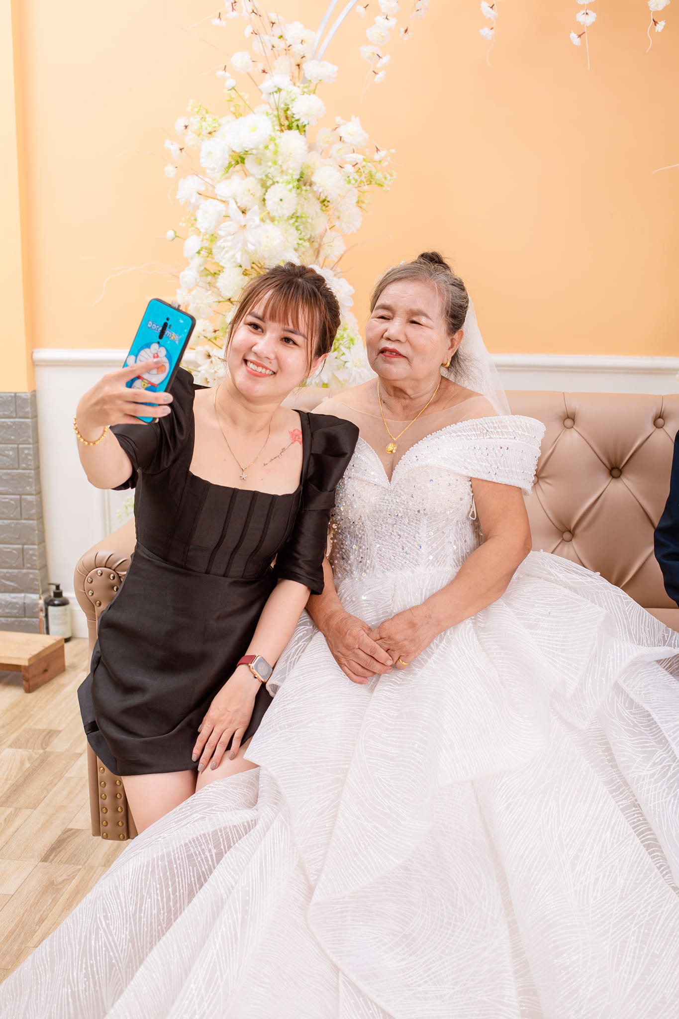 Rồi chị để ý, đám cưới nào bà Nhung cũng đi xem cô dâu mặc váy cưới có đẹp không. Chị bỗng nghĩ đến chuyện giúp bố mẹ được lộng lẫy một lần. Ban đầu, ông bà còn ngại ngùng, sợ mọi người trêu già rồi còn xí xọn. Nhưng sau khi được chị thuyết phục, cả hai đã đồng ý.