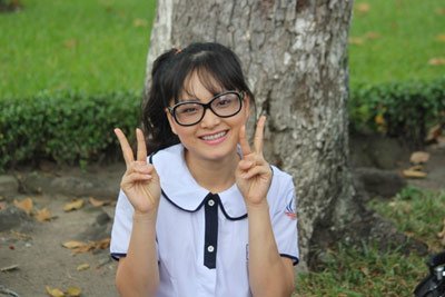 | MC Lan Phương trong bộ đồ học sinh hồn nhiên nhí nhảnh, và cặp mắt kính “xì tin” |