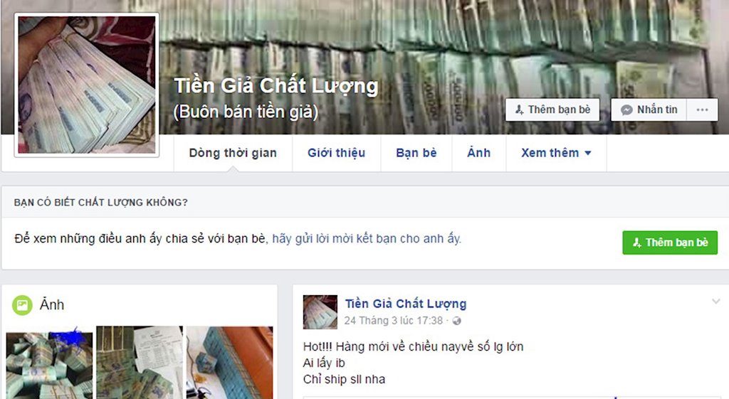 Như ICTnews đã có nhiều bài phản ánh, trong phần chính sách Facebook nêu rõ bài viết không được quảng bá việc bán tiền thật, tiền ảo hoặc tiền giả. Thế nhưng, với từ khóa "tiền giả", người dùng dễ dàng tìm thấy những hội nhóm mua bán, trao đổi tiền giả và cả tiền thật. Ngoài những hội nhóm chuyên chứa chấp hoạt động này, nhiều group cộng đồng cũng thường xuyên xuất hiện những bài viết quảng bá cho hoạt động kinh doanh tiền giả. Việc rao bán tiền giả trên Facebook diễn ra từ nhiều năm qua nhưng không được Facebook có biện pháp ngăn chặn.