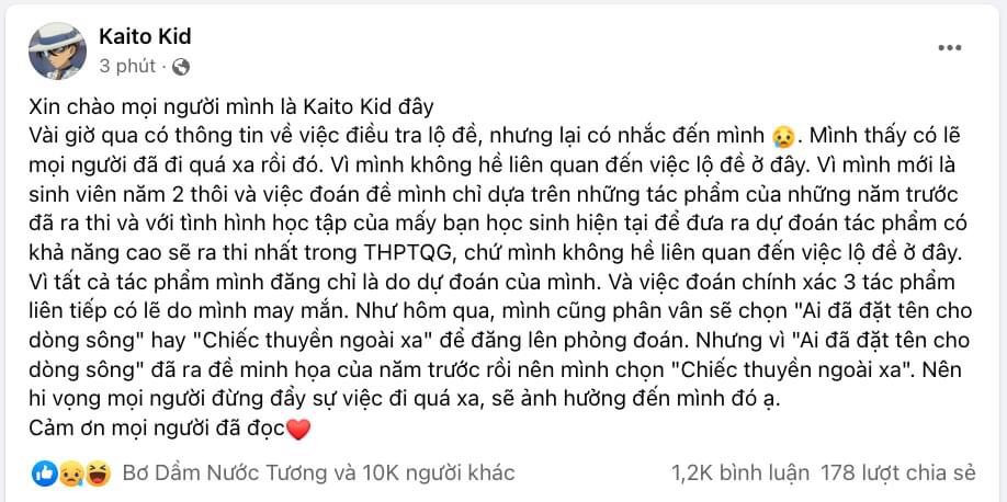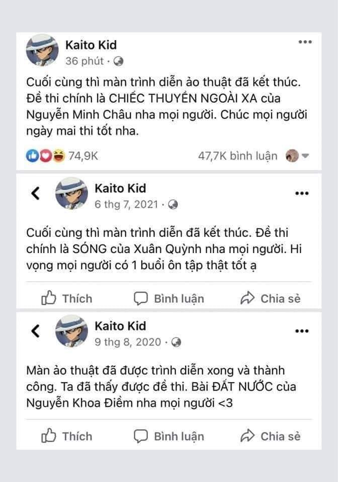 Cũng sau buổi thi sáng nay, mạng xã hội xôn xao về một tài khoản khá nổi tiếng trên mạng xã hội tên Kaito Kid đã đoán trúng đề thi Ngữ văn THPT.