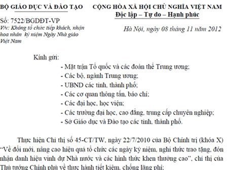 Văn bản do Thứ trưởng Bộ GD-ĐT Trần Quang Quý ký chính thức gửi tới các bộ, ngành, các ĐH, học viện, các trường ĐH, CĐ, TCCN và Sở GD-ĐT các tỉnh, thành phố, các cơ quan báo chí.... phổ biến việc không tổ chức tiếp khách, không nhận hoa nhân ngày kỷ niệm Nhà giáo Việt Nam.