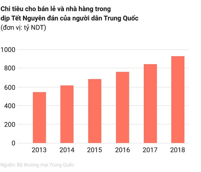 Năm 2018, người Trung Quốc chi khoảng 900 tỷ NDT (3,085 triệu tỷ đồng cho hoạt động mua sắm, ăn uống, vui chơi. Ước tính, mỗi hộ gia đình tăng chi tiêu khoảng 60% so với ngày thường trong dịp Tết.