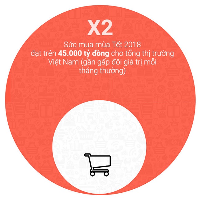 Sức mua mùa Tết 2018 ước tính đạt trên 45.000 tỷ đồng cho tổng thị trường Việt Nam, gần gấp đôi giá trị mỗi tháng thường, tương đương với 1% tổng GDP 2017, bà Bạch Dương thông tin thêm, dẫn số liệu từ báo cáo Tết năm 2018 do Kantar Worldpanel tính toán dựa trên số liệu của Tổng cục Thống kê.