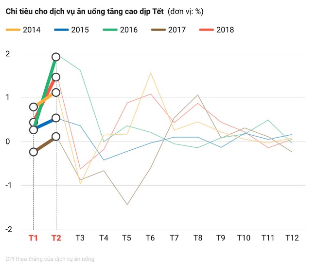 Trong 5 năm trở lại đây (thời điểm người lao động bắt đầu được nghỉ Tết 7-9 ngày), tăng trưởng giá tiêu dùng mảng nhà hàng, thực phẩm tháng 1 và tháng 2 tăng đều đạt cao nhất trong năm - ngay cả vào những thời điểm nền kinh tế chững lại, như năm 2014 hay 2016.
