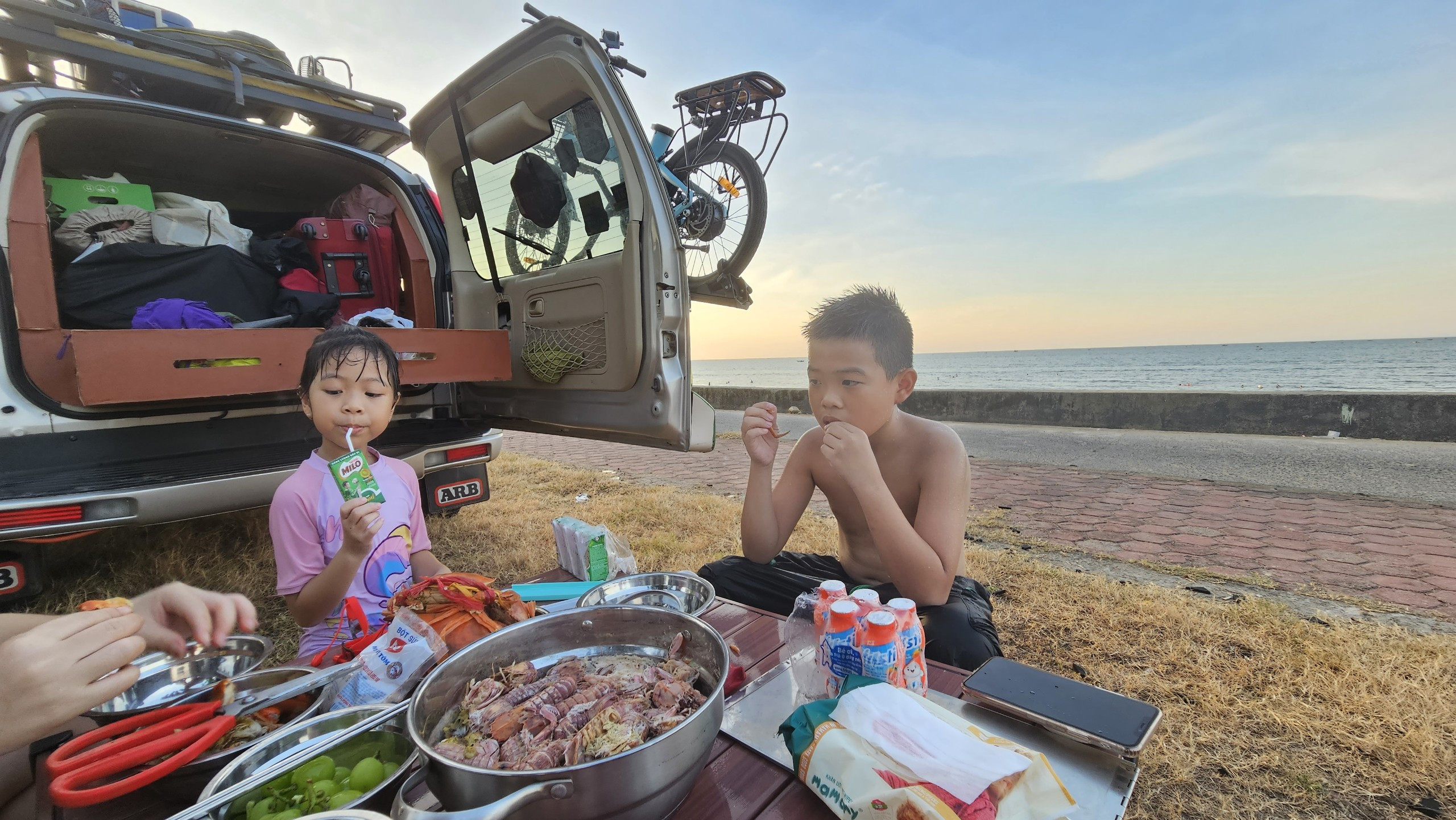 Gia đình này luôn dừng xe trước 16h để dành thời gian vui chơi ở biển, ăn hải sản, đặc sản địa phương, khám phá thành phố về đêm.