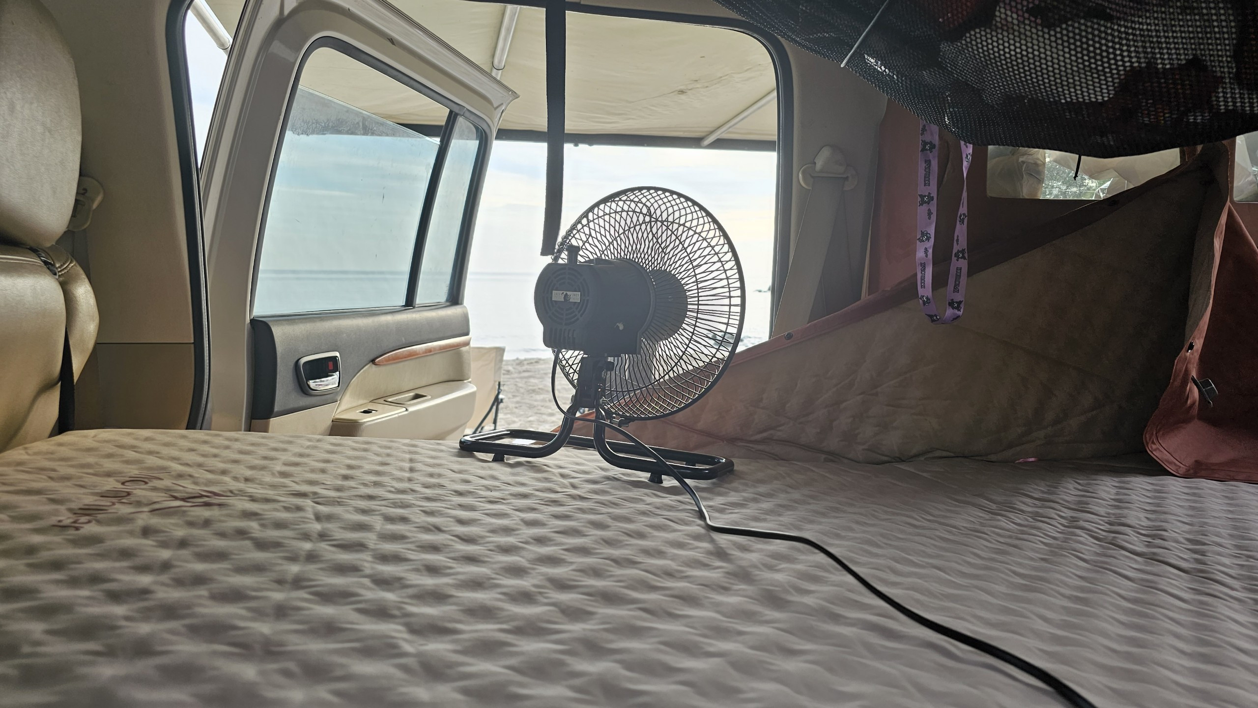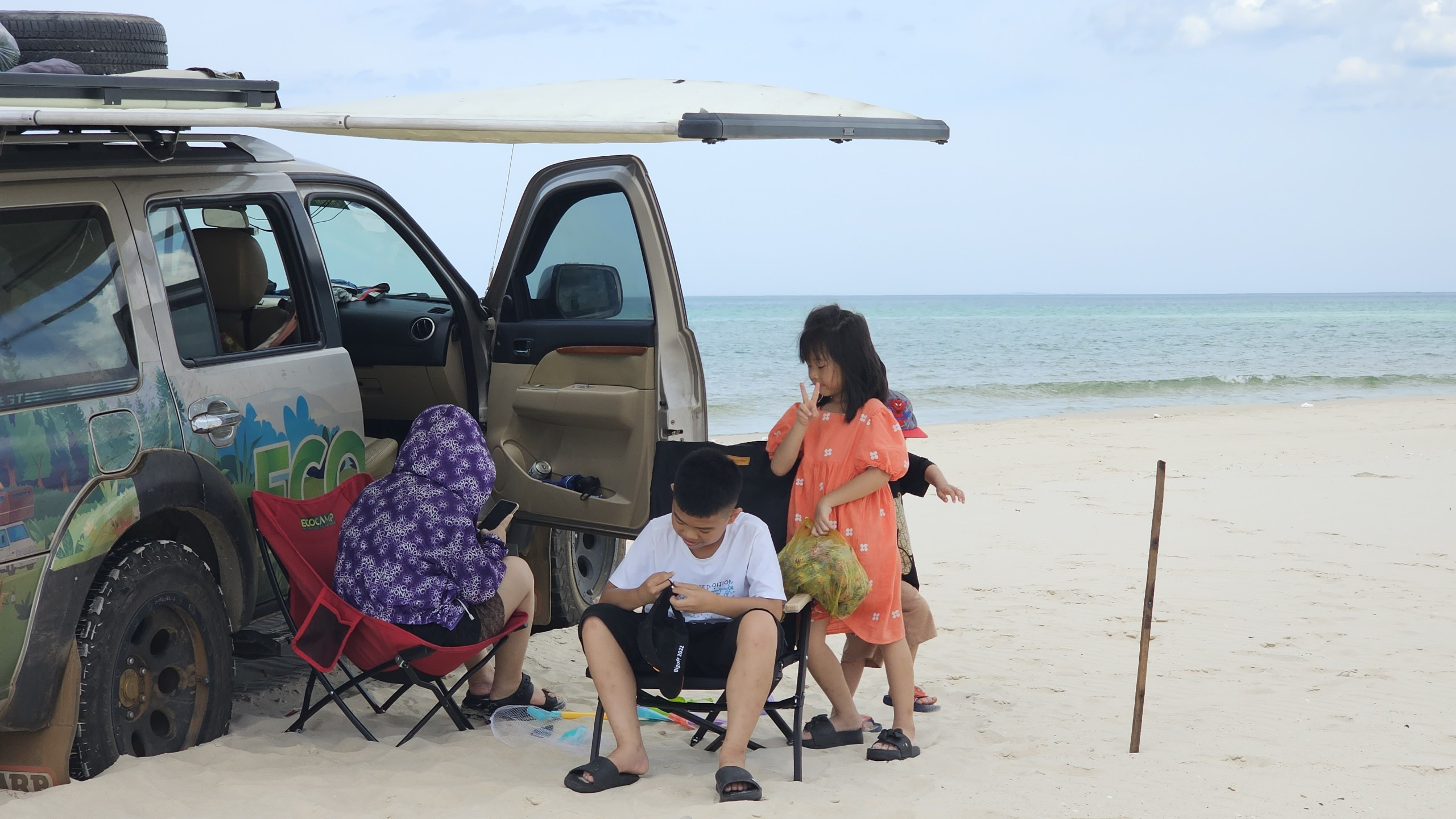 Nếu thời tiết đẹp, cả nhà dựng lều bên ngoài xe. Nếu trời lạnh, hay mưa, anh Trường sẽ xếp hệ thống ghế gấp để tạo giường 3 người ngay trong xe, mở thêm lều nóc.