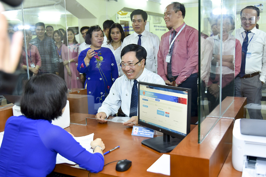 Phó Thủ tướng và các đại biểu tham quan và trực tiếp thử nghiệm dịch vụ tại bộ phận một cửa |