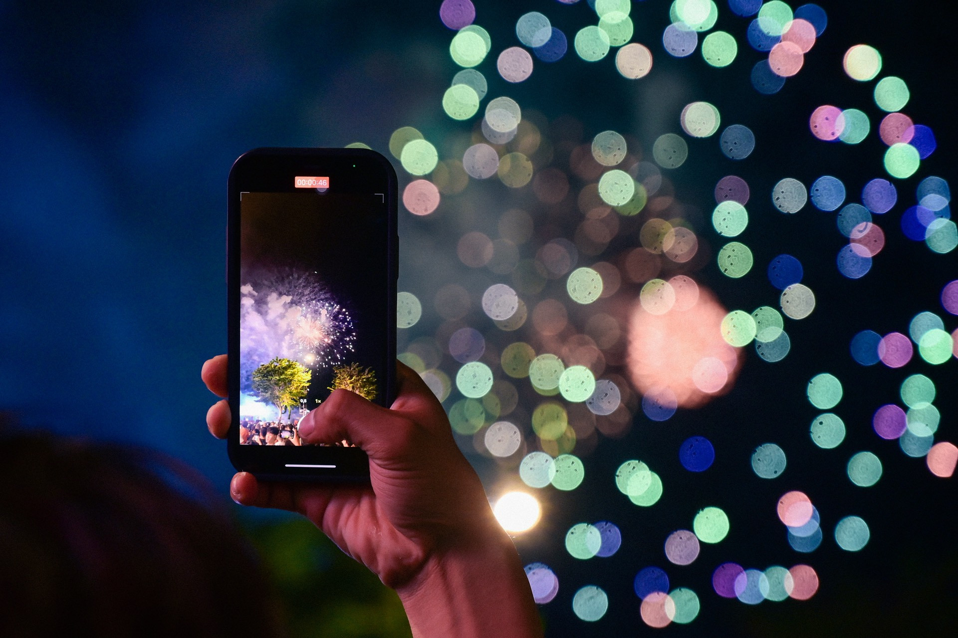 Nhiều bạn trẻ dùng điện thoại để lưu lại hình ảnh những chùm pháo hoa nhiều màu sắc.