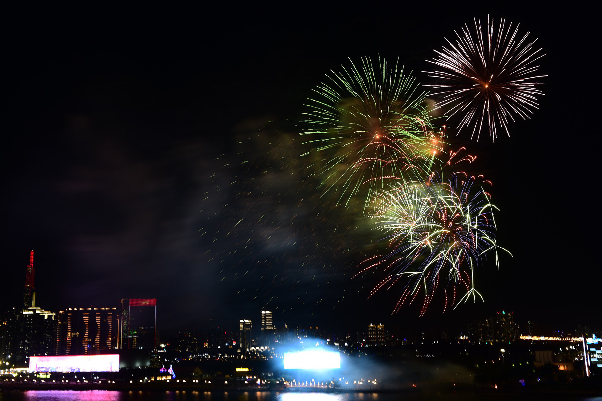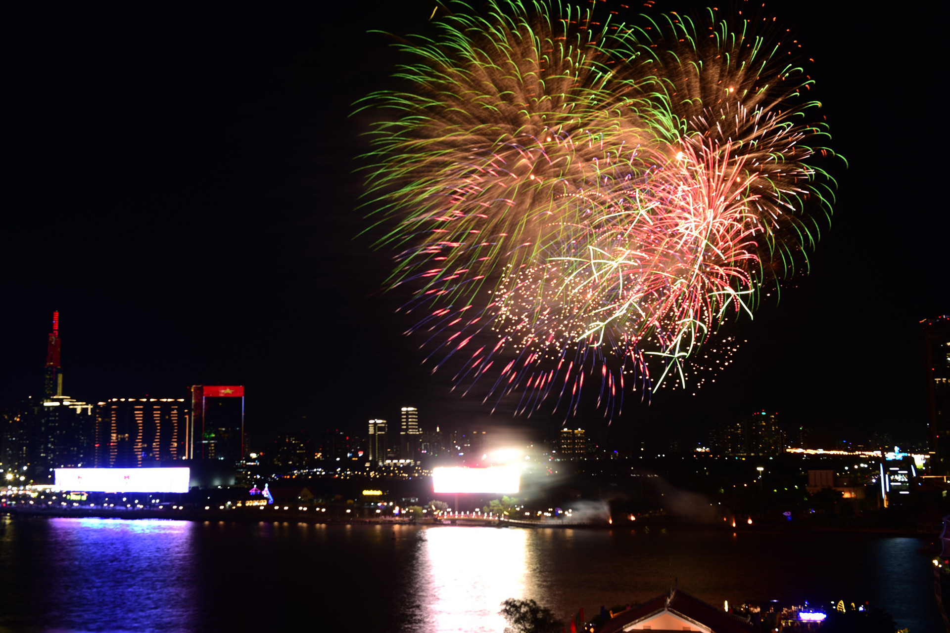 Đúng 21h những loạt pháo hoa đầu tiên được bắn trên bầu trời TP.HCM. Hàng nghìn người hò reo tỏ ra thích thú.