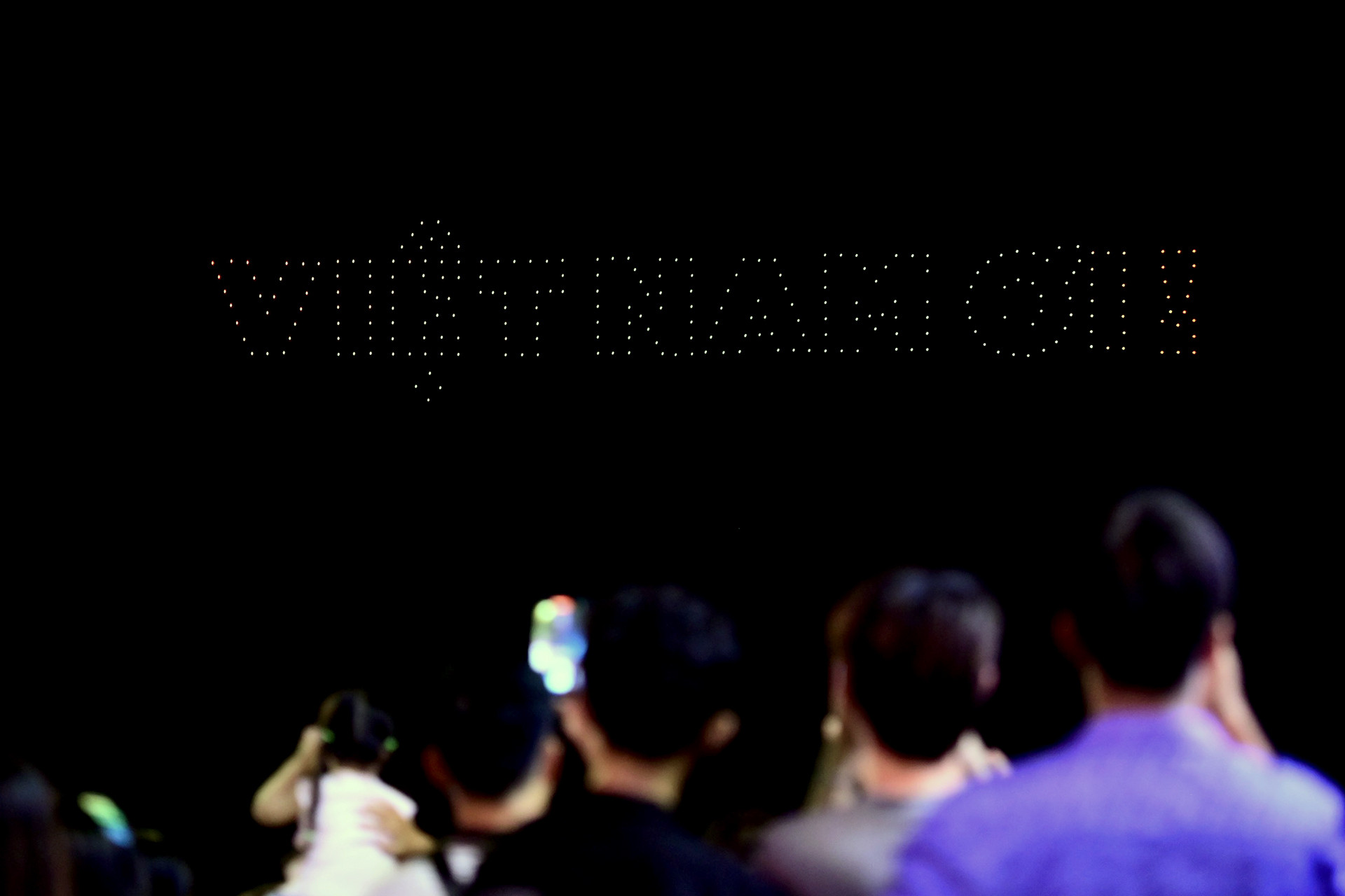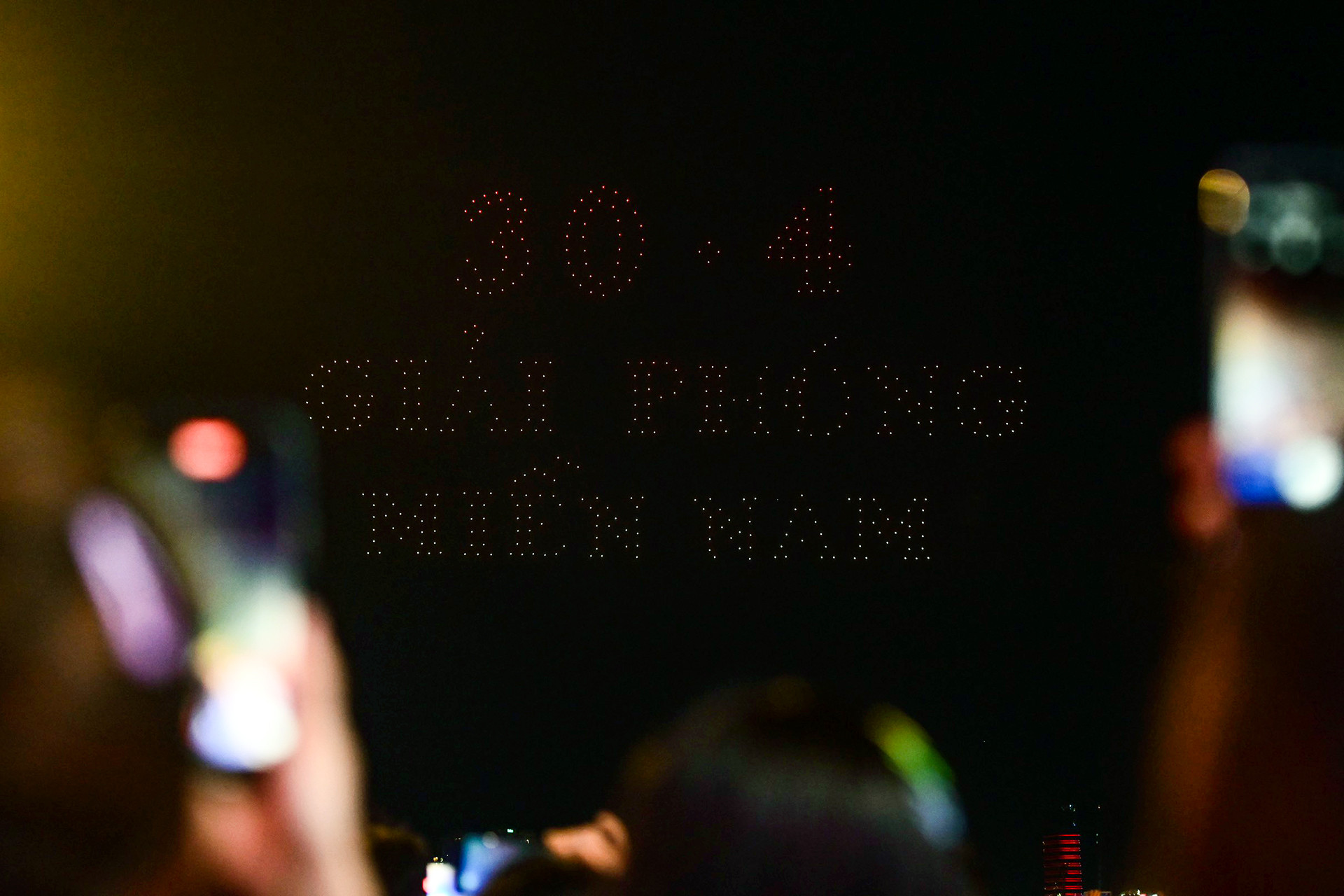 Vào lúc 20h30, màn trình diễn ánh sáng bằng drone (máy bay không người lái) với nhiều hình ảnh mang ý nghĩa kỷ niệm 49 năm thống nhất đất nước khiến nhiều người thích thú.