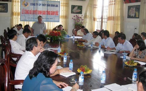 | Toàn cảnh phiên họp giữa Công ty CP thủy sản Bình An đối thoại giữa các ngân hàng, nông dân để tìm ra phương án bán nợ và trả nợ. |