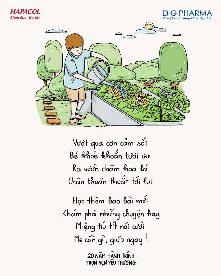 Bộ tranh thơ gợi nhớ đến những kỉ niệm thơ ấu của nhiều người, khi những cơn sốt, cơn đau đến bất chợt, khiến những phút giây sum họp của gia đình thiếu đi niềm vui và tiếng cười. Trong những khoảnh khắc đó, không có gì dễ chịu hơn là sự vỗ về dịu dàng của mẹ cùng người bạn đồng hành Hapacol, giúp “Hạ cơn sốt, giảm cơn đau”.