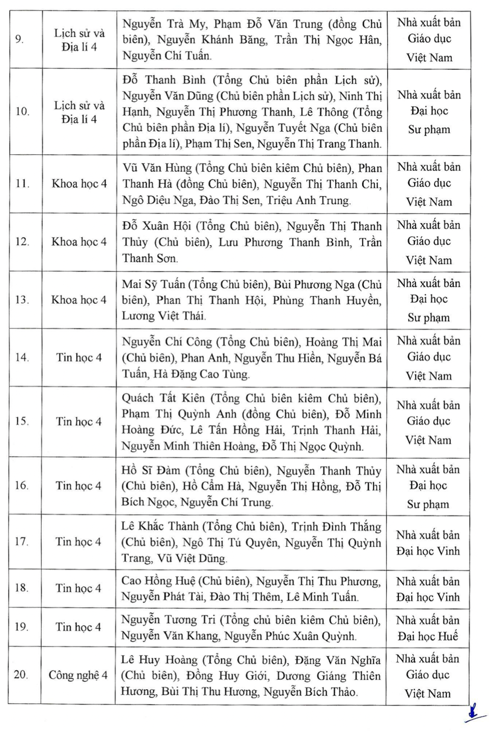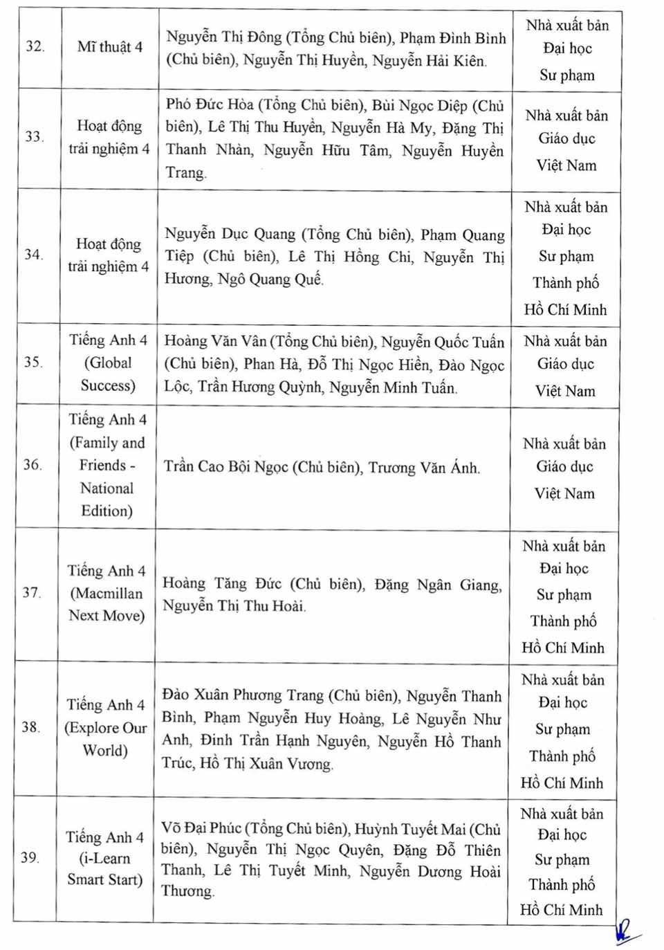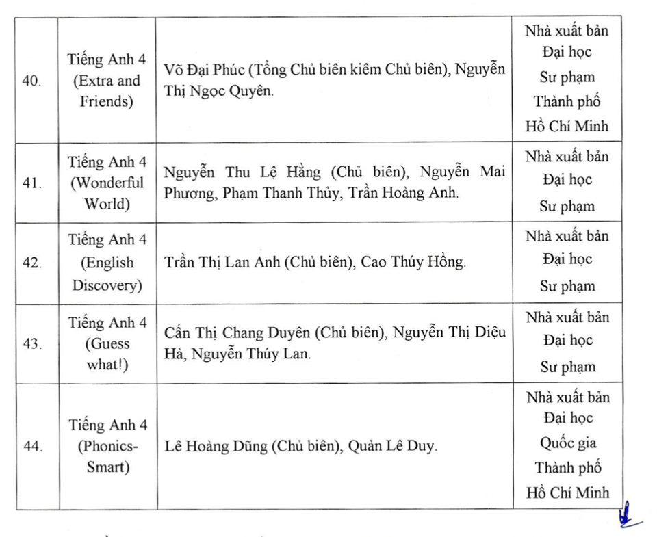 Danh mục sách giáo khoa lớp 4 bao gồm 44 đầu sách giáo khoa: