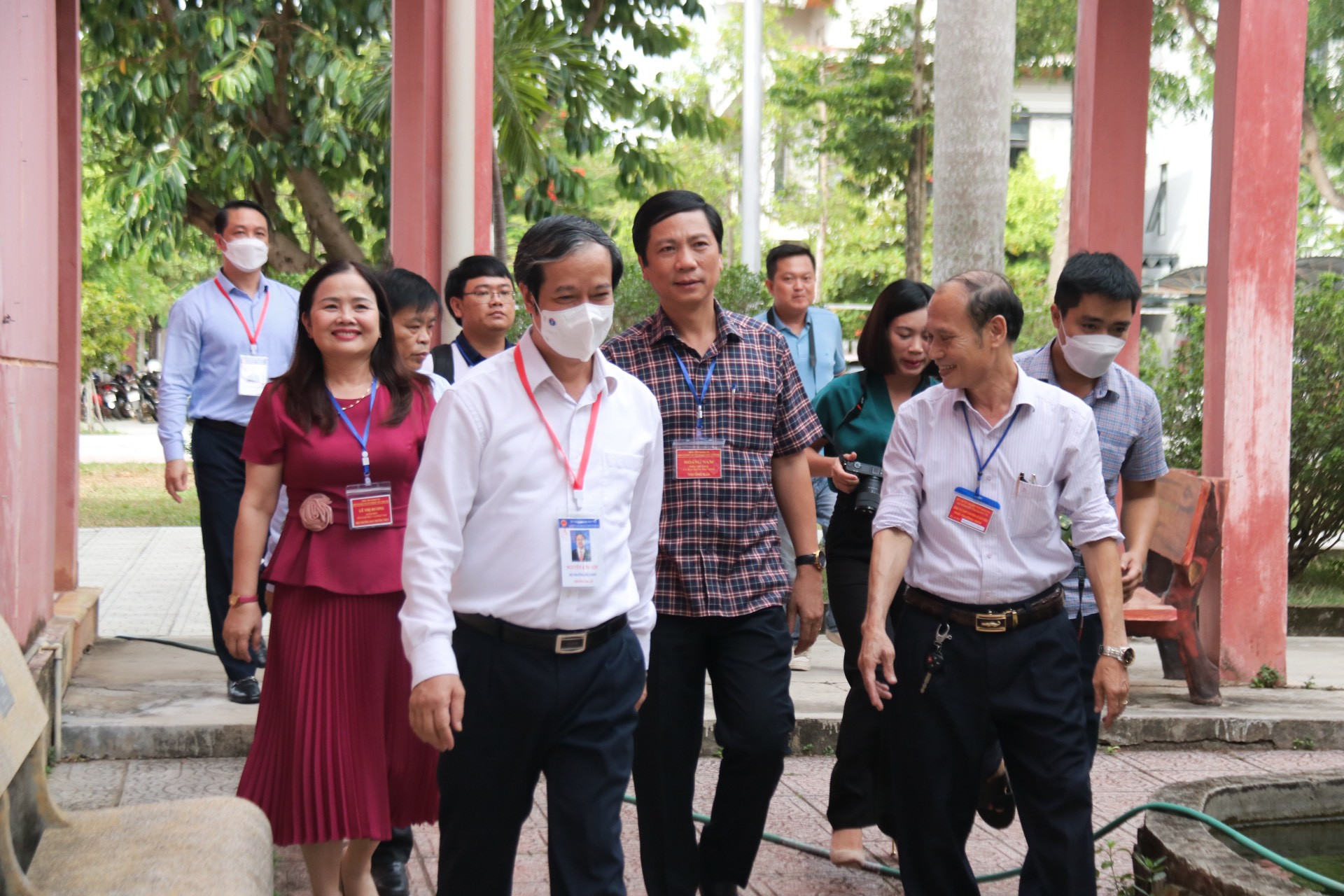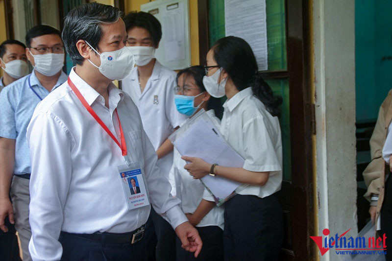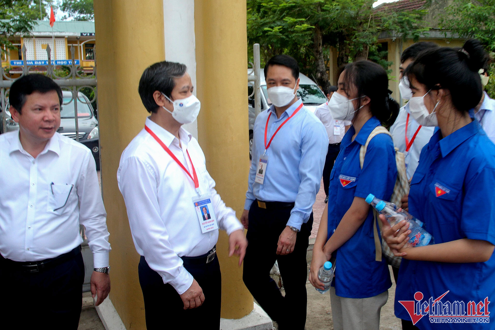 Tại đây, Bộ trưởng đã đi kiểm tra tại phòng hội đồng thi, công tác bảo mật đề thi, động viên thăm hỏi cán bộ y tế và dặn dò những điều cần thiết khi thí sinh thi trong trời nóng bức.