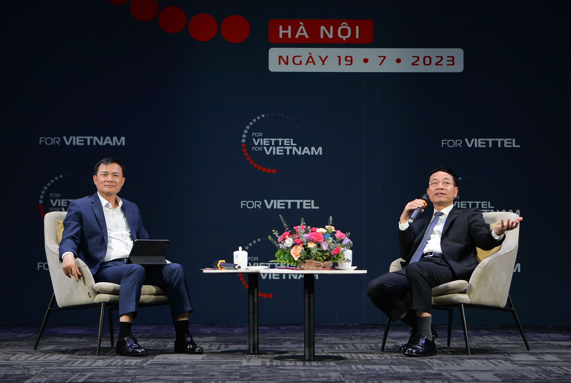 Bộ trưởng Nguyễn Mạnh Hùng tiếp lời: Trước Viettel đứng trên vai người khác, giờ hãy để người khác đứng trên vai mình. Mình làm nền tảng, mình xuống tầng công nghệ nguồn, công nghệ cốt lõi, đấy mới thực sự là làm chủ. Khi đó rất nhiều người khác sẽ đứng trên vai mình để phát triển và vì thế mà Viettel có thể dẫn dắt cộng đồng doanh nghiệp số Việt Nam lớn mạnh.