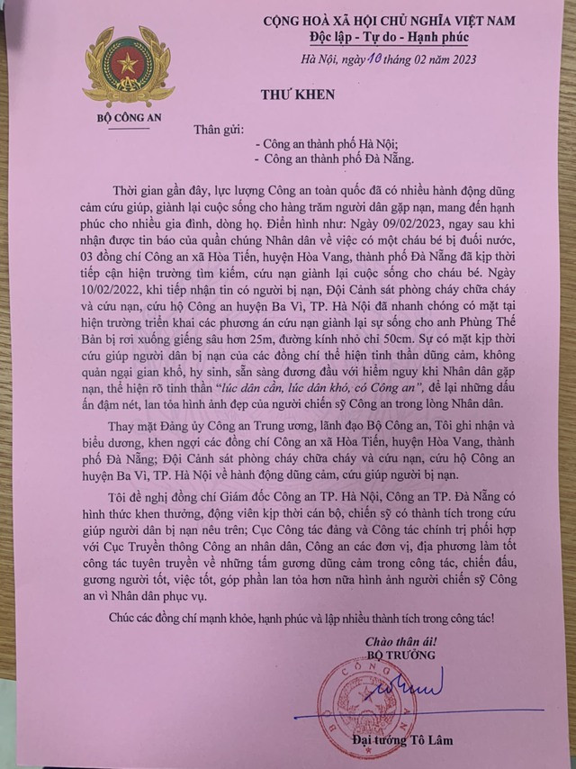 "Thay mặt Đảng ủy Công an Trung ương, lãnh đạo Bộ Công an, tôi ghi nhận và biểu dương, khen ngợi các đồng chí Công an xã Hòa Tiến và Đội Cảnh sát PCCC và CNCH Công an huyện Ba Vì về những hành động dũng cảm, cứu người bị nạn", Đại tướng Tô Lâm viết trong thư khen.