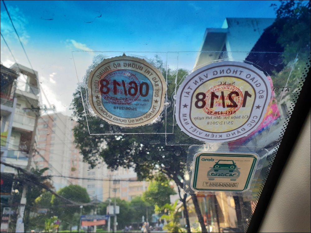 Tem kinh doanh GrabCar trên một chiếc xe kinh doanh dùng nền tảng Grab - Ảnh: Hải Đăng |