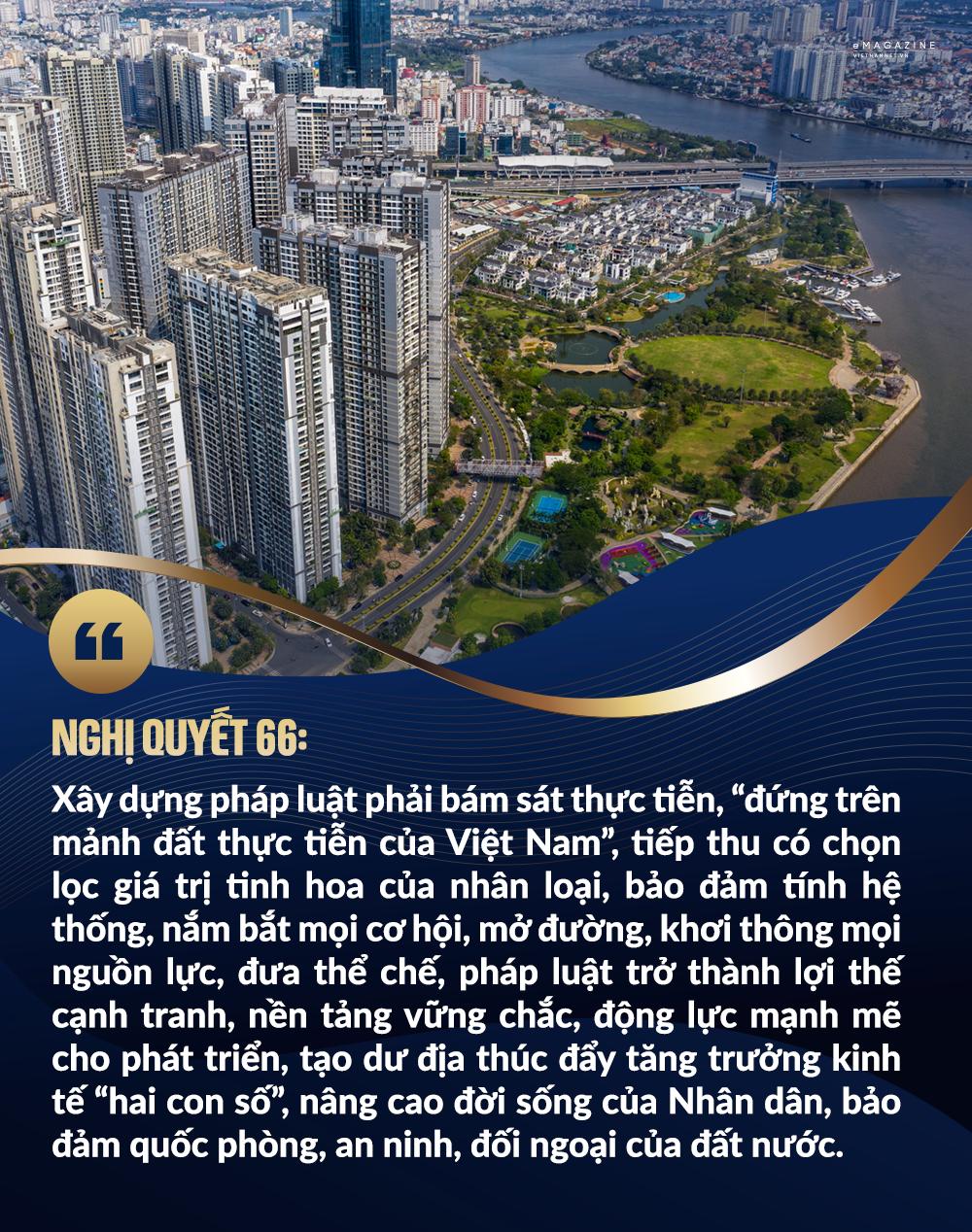 Nghị quyết 66 nhắm vào nền móng thể chế: Đổi mới toàn diện công tác xây dựng và thi hành pháp luật. Nghị quyết chuyển tư duy từ “quản lý” sang “phục vụ”, từ pháp luật điều chỉnh thụ động sang pháp luật đi trước và dẫn dắt sự phát triển.