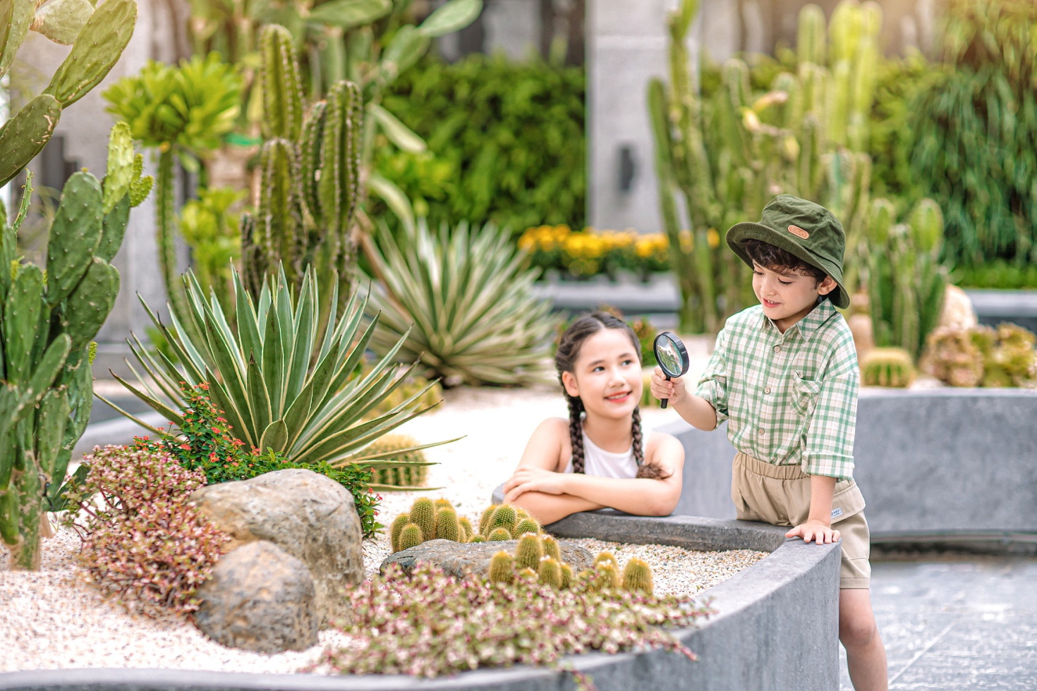 Điểm đến đầu tiên là vườn sinh vật học, nơi được mô phỏng như một khu rừng nhỏ với thảm thực vật độc đáo đến từ các đới khí hậu khác nhau trên thế giới. Cây cỏ, hoa lá đan xen cùng thác nước trong mát được sắp xếp một cách nghệ thuật sẽ mang đến cuộc sống gần gũi thiên nhiên và tạo không gian hoàn hảo cho sự phát triển của con trẻ. Trẻ sẽ được quan sát thực tế môi trường sống của thực vật để tìm hiểu thêm về khoa học tự nhiên và có những giây phút "chơi mà học" mỗi ngày.
