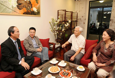 Phó Thủ tướng Nguyễn Thiện Nhân đến thăm gia đình GS.Ngô Bảo Châu trong căn hộ mới. (Ảnh: Chinhphu.vn)