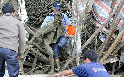 Lập tức lực lượng cứu hộ lao vào, dùng bàn tay bới bê tông đang còn tươi để đưa người này lên và chuyển đi bệnh viện.