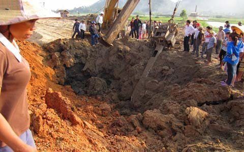 | Hiện trường công nhân thi công cầu Cấm ép cọc bị bom phát nổ. |