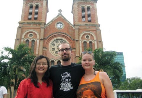 | Người viết và Joel, Emmy, hai Couch Surfer người Thụy Điển chụp hình trước Nhà thờ Đức Bà |