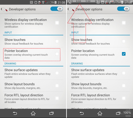 Giờ bạn kéo xuống cho đến khi tìm thấy phần Nhập liệu (Pointer location/Touch data hoặc tương tự tùy vào điện thoại) và chọn Hiện chạm (Show touches) rồi kiểm tra các nút chạm. Ngay lập tức bạn có thể thấy một thanh chỉ số xuất hiện chồng lên trên thanh trạng thái của điện thoại nằm ở phía trên cùng màn hình gồm nhiều giá trị. Đồng thời các vòng tròn màu xám nhỏ sẽ xuất hiện dưới ngón tay bạn tại bất cứ điểm nào trên màn hình mà bạn chạm.