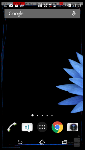 Bước 4: Tiếp theo bạn có thể cần kiểm tra xem các góc hoặc phần dưới cùng của màn hình có nhạy không. Bạn chỉ cần trượt các ngón tay trên các góc màn hình mà bạn nghi ngờ là không nhạy. Bắt đầu bằng cách dùng nhiều lực sau đó giảm dần đến mức chạm hờ. Bạn cần quan sát giá trị Prs (thứ 2 từ phải qua) có lên xuống theo mỗi lần bạn làm như vậy không. Chỉ số này đo lượng áp lực mà màn hình cảm ứng nhận. Một mà hình cảm ứng tồi sẽ cần nhiều áp lực để nhận ra các thao tác chạm tại một số góc của màn hình hoặc thậm chí không nhận ra được. Và lúc này bạn cần gọi điện cho nhà sản xuất rồi đấy! Một màn hình cảm ứng tốt sẽ chỉ cần một áp lực khoảng 0,05 mà thôi.