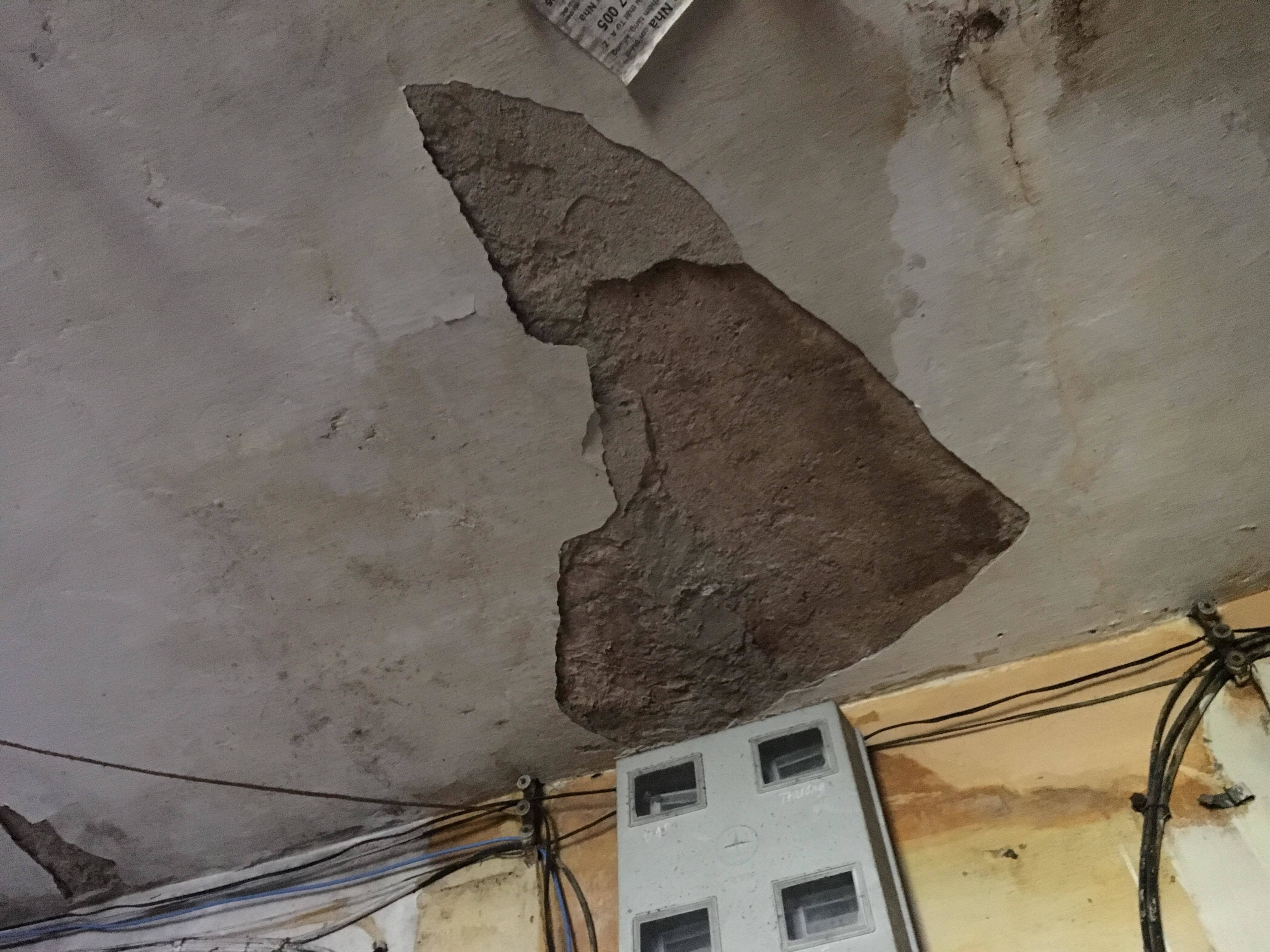 | Trần nhà G6A liên tục bị nứt vỡ, vôi vữa rơi rụng từng mảng lớn. Ảnh: Thanh Hải |