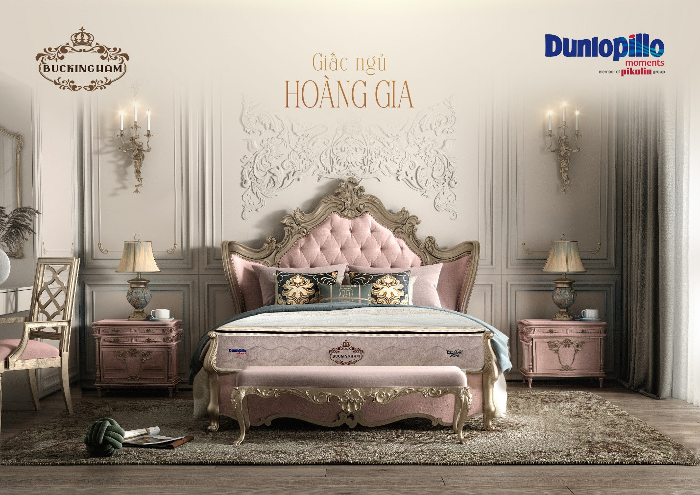 Lấy cảm hứng từ cung điện Buckingham hoàng gia Anh, Dunlopillo cho ra đời sản phẩm Buckingham với thiết kế sang trọng giúp tạo nên giá trị thẩm mỹ cho không gian nội thất.