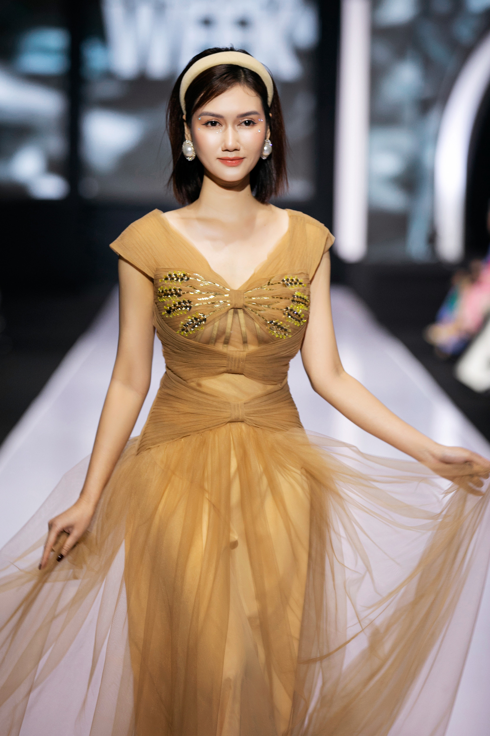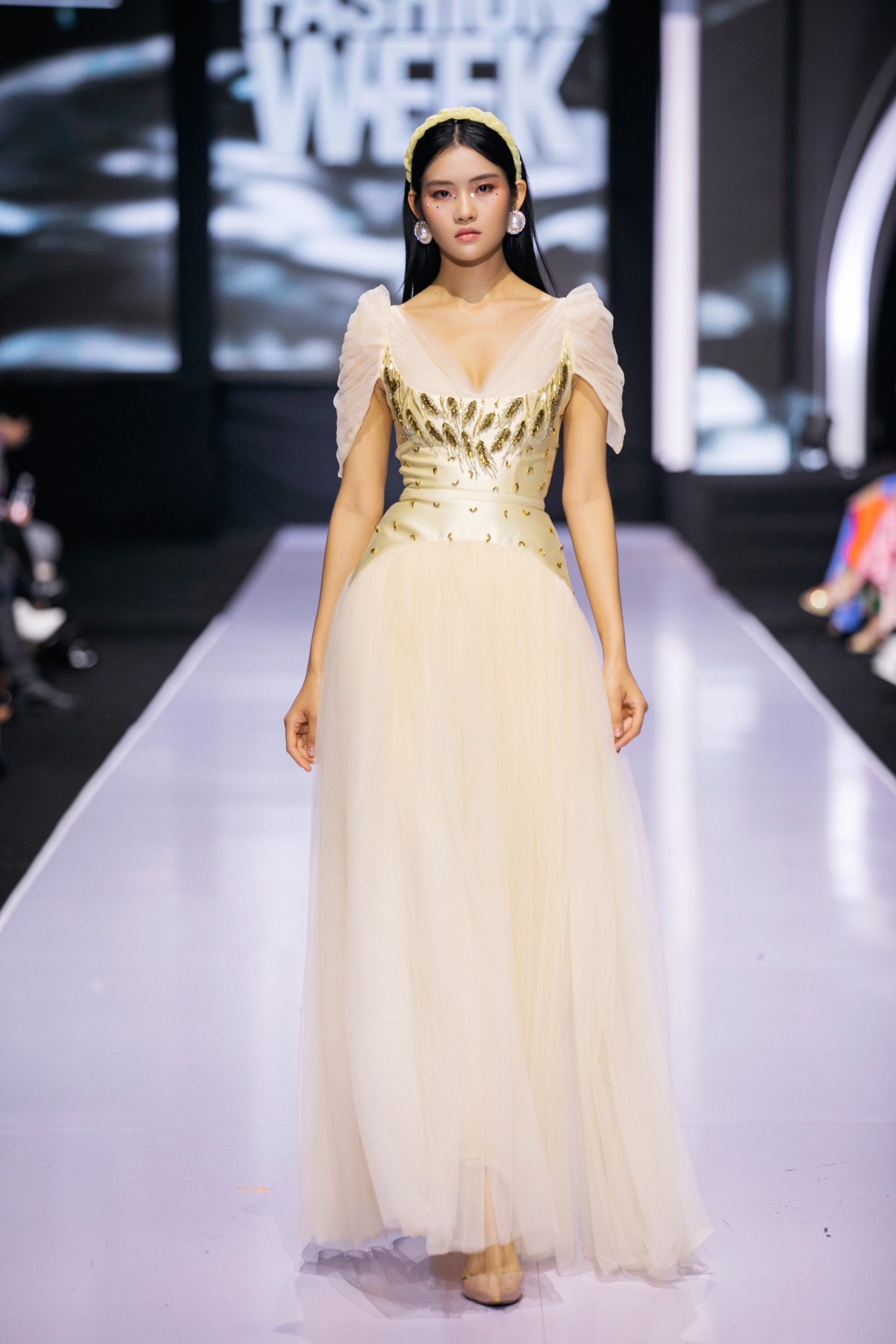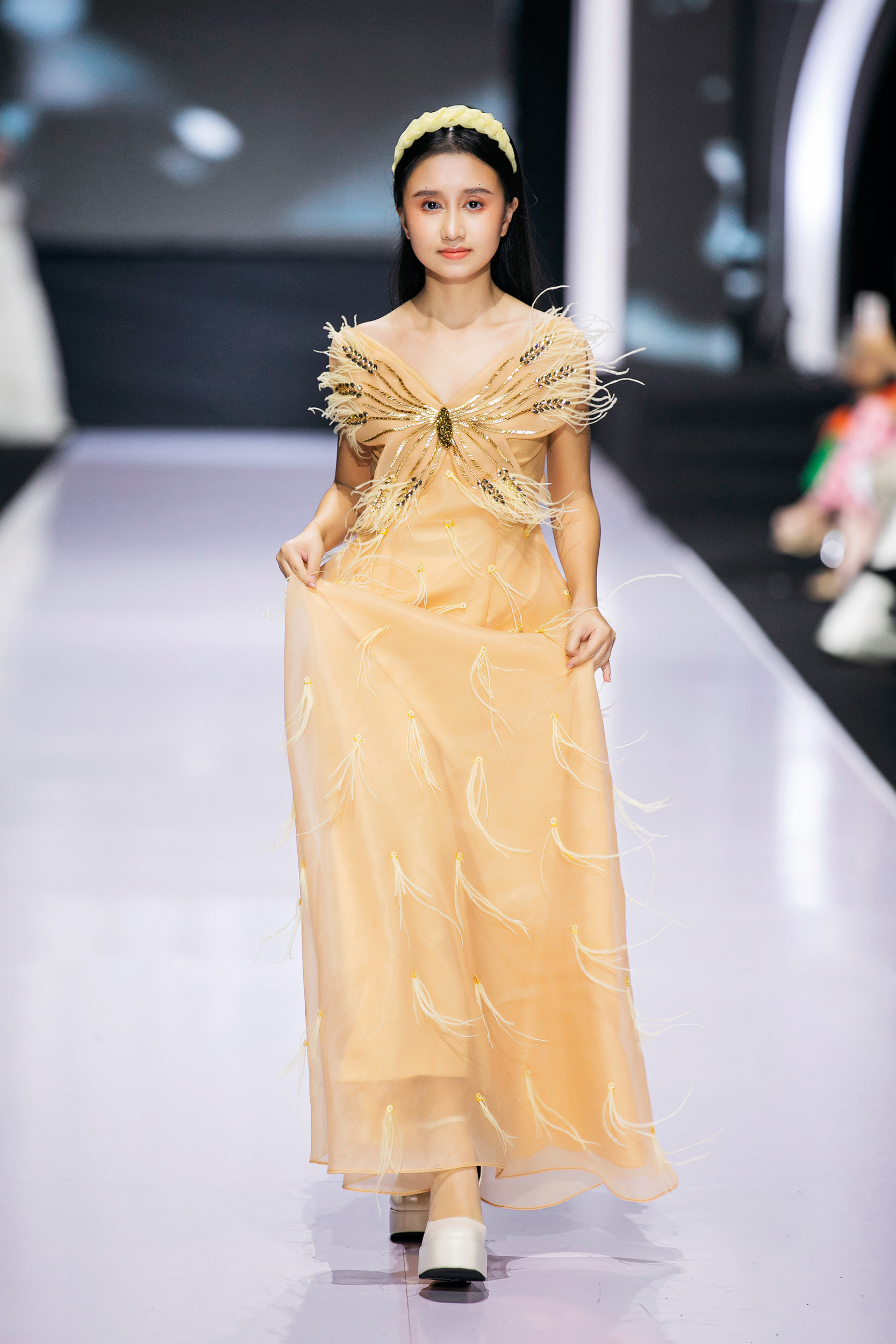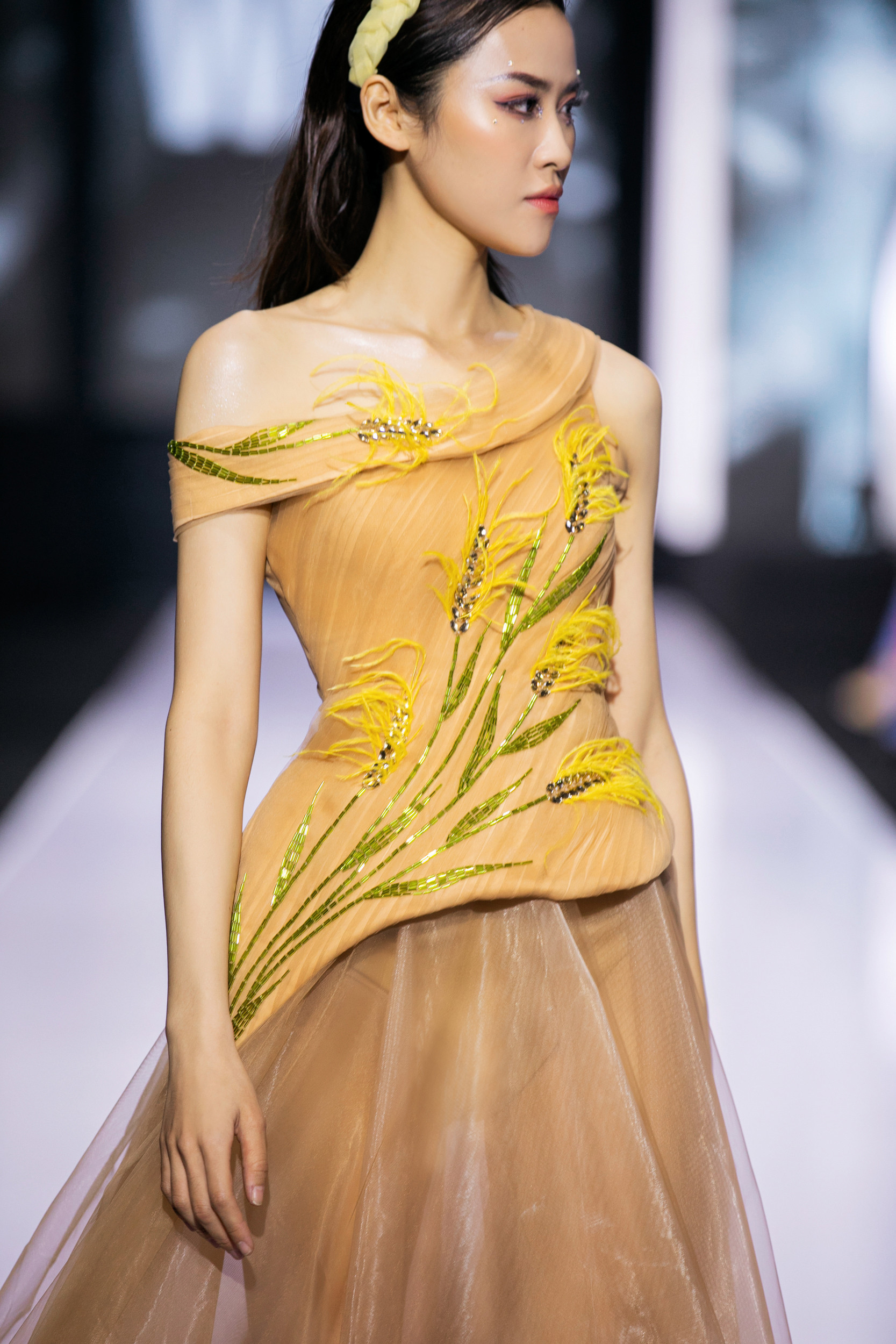 Gần 40 thiết kế được các người mẫu thể hiện sử dụng đa dạng chất liệu như lưới, taffa, lụa hay Organza và gam màu chủ đạo gồm vàng, kem, be, nâu…, đây đều là những gam màu thể hiện hình ảnh bông lúa.