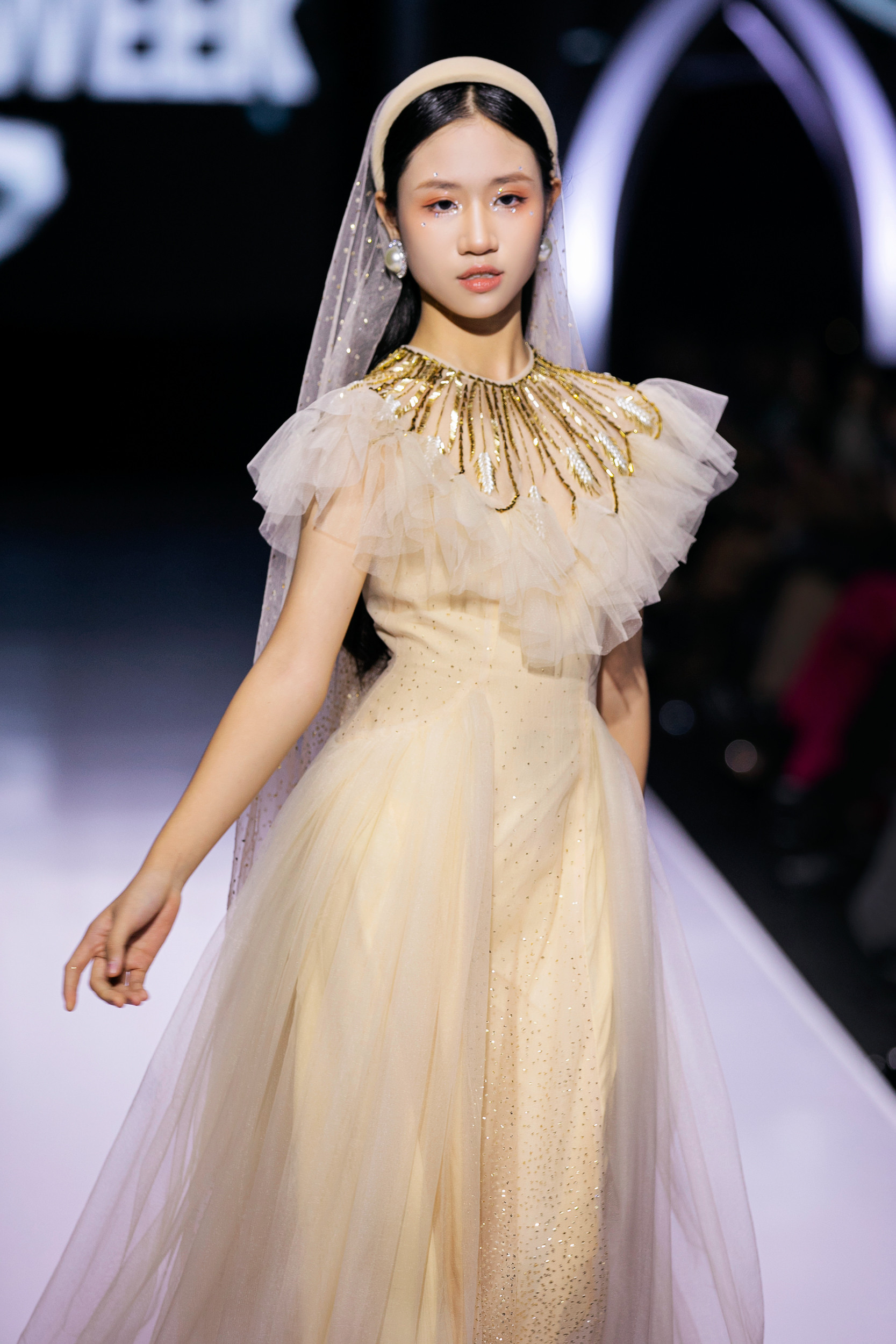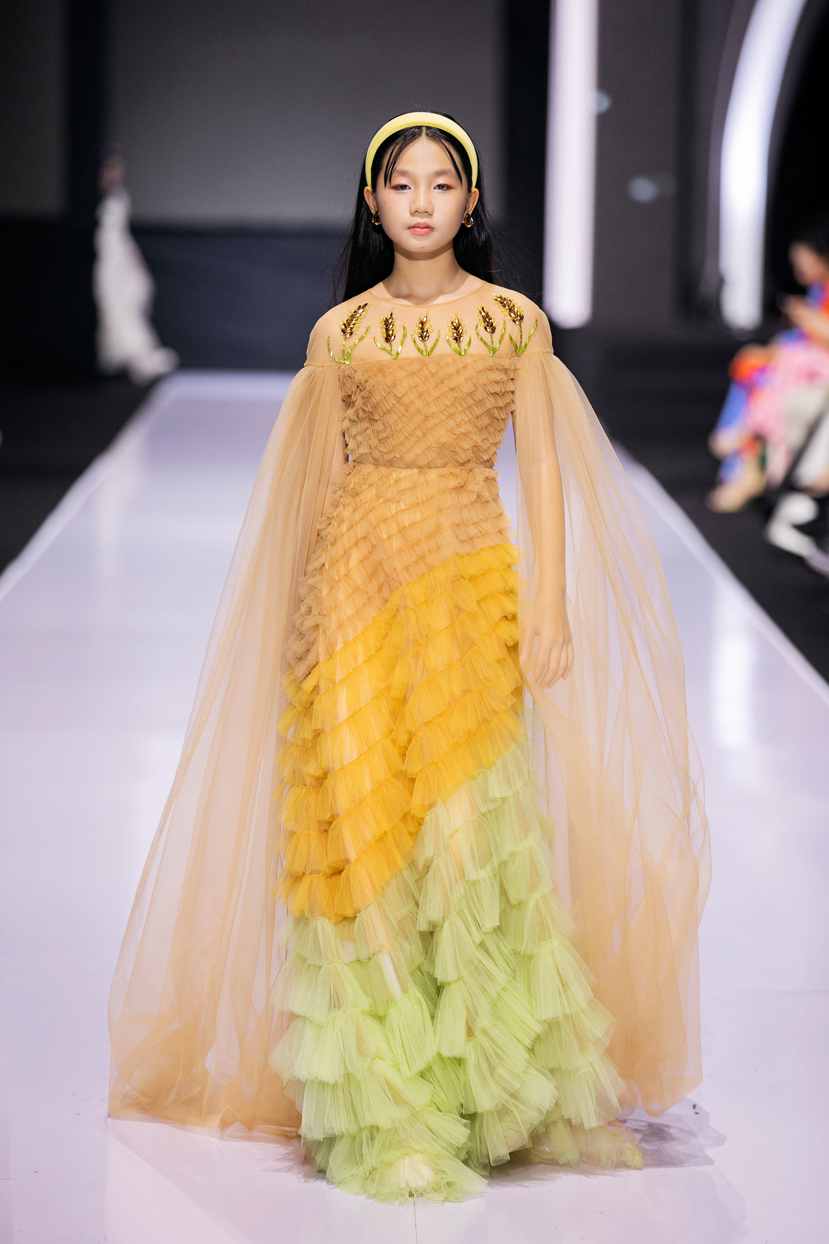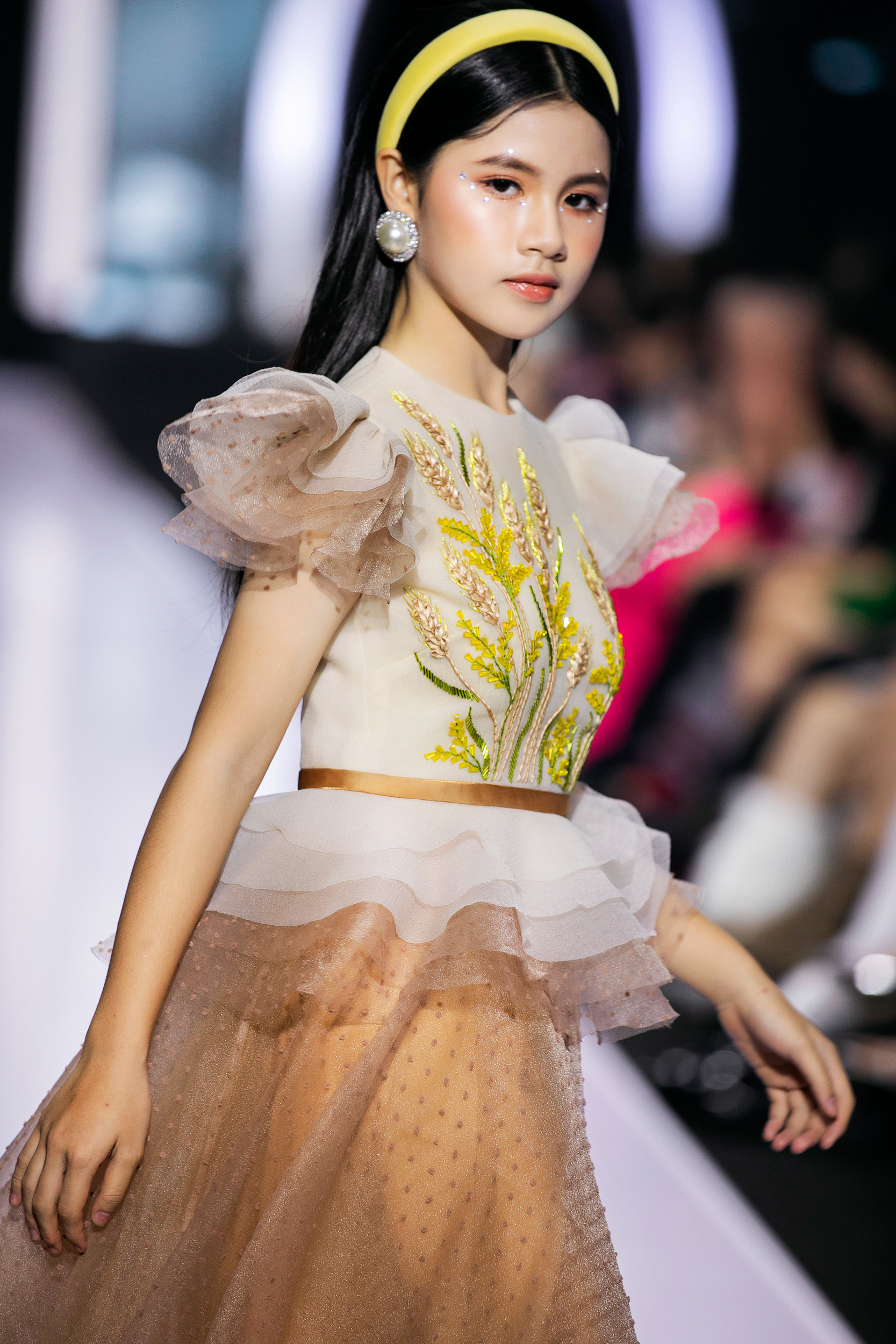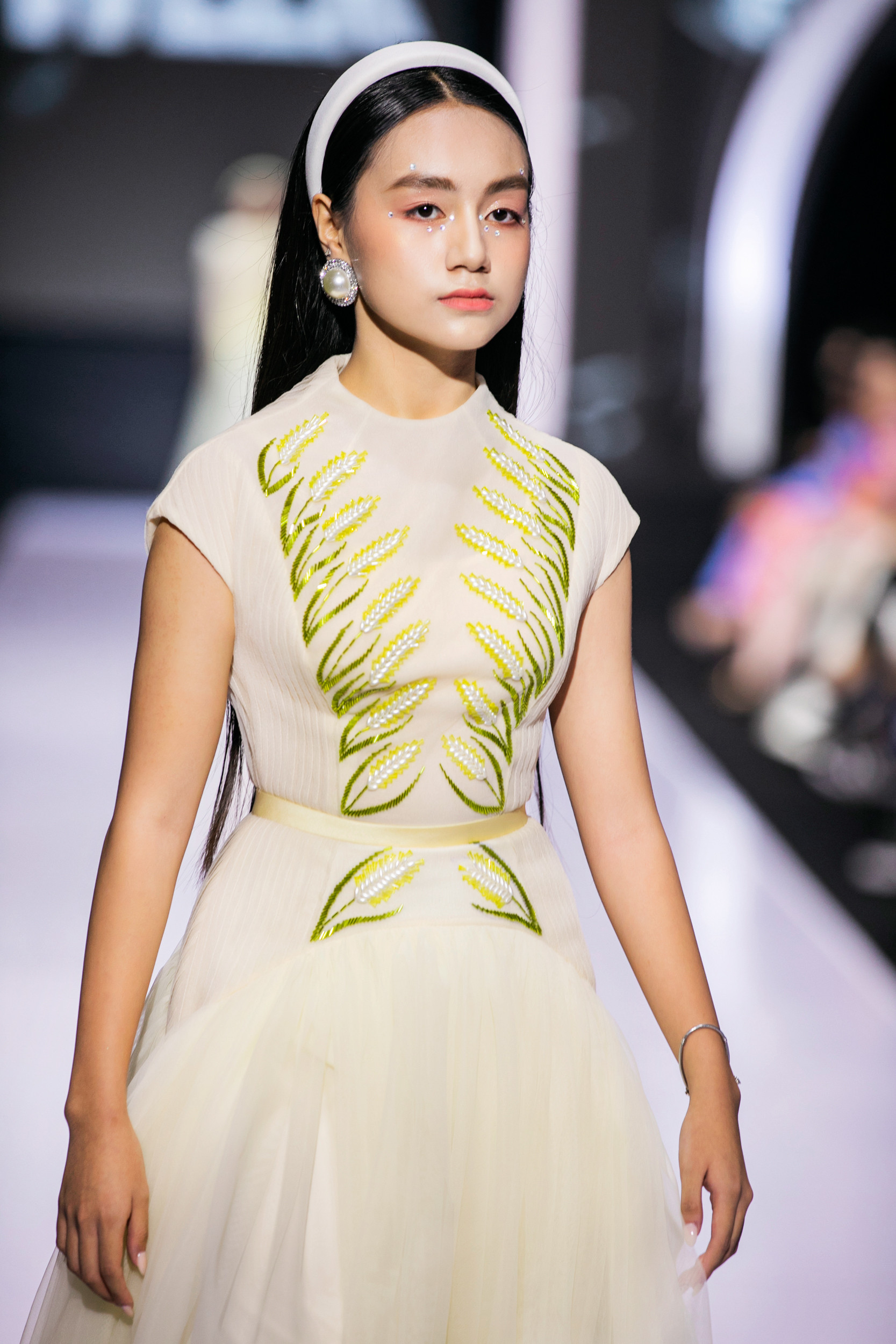 Gần 40 thiết kế được các người mẫu thể hiện sử dụng đa dạng chất liệu như lưới, taffa, lụa hay Organza và gam màu chủ đạo gồm vàng, kem, be, nâu…, đây đều là những gam màu thể hiện hình ảnh bông lúa.