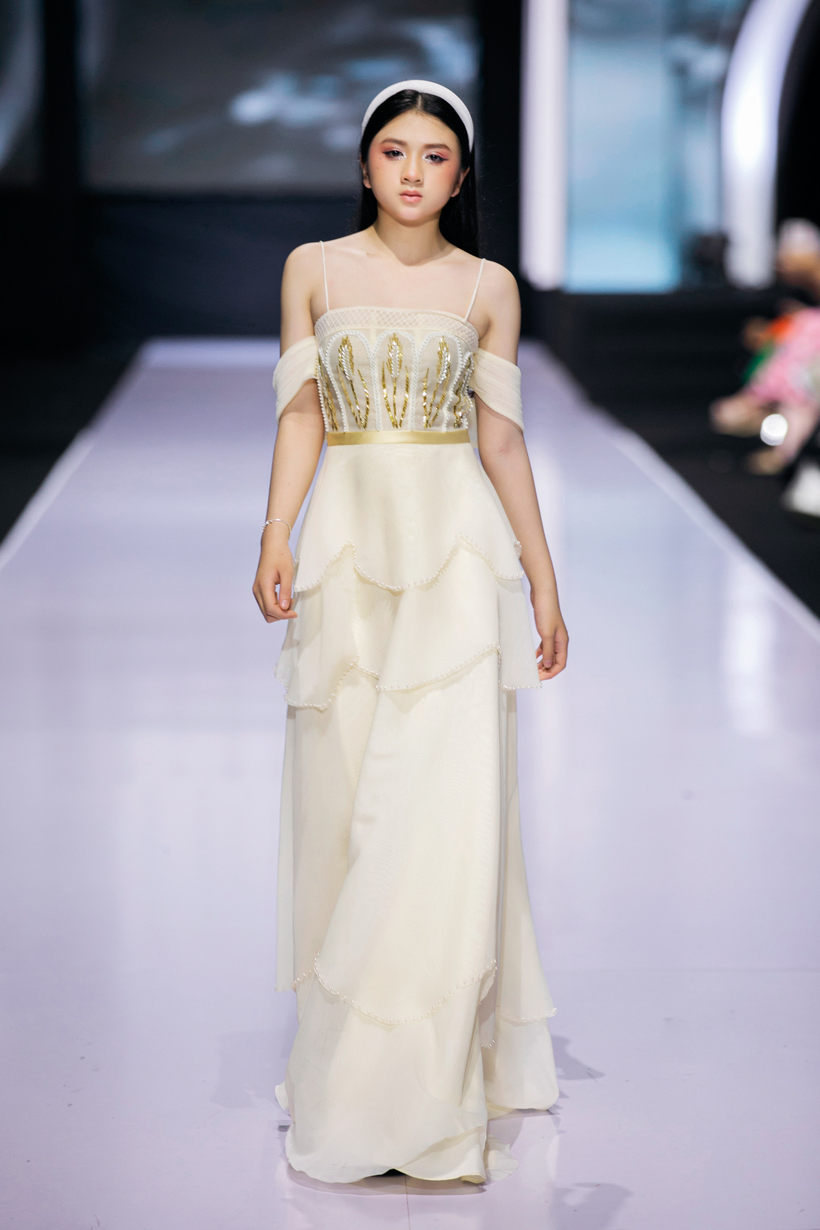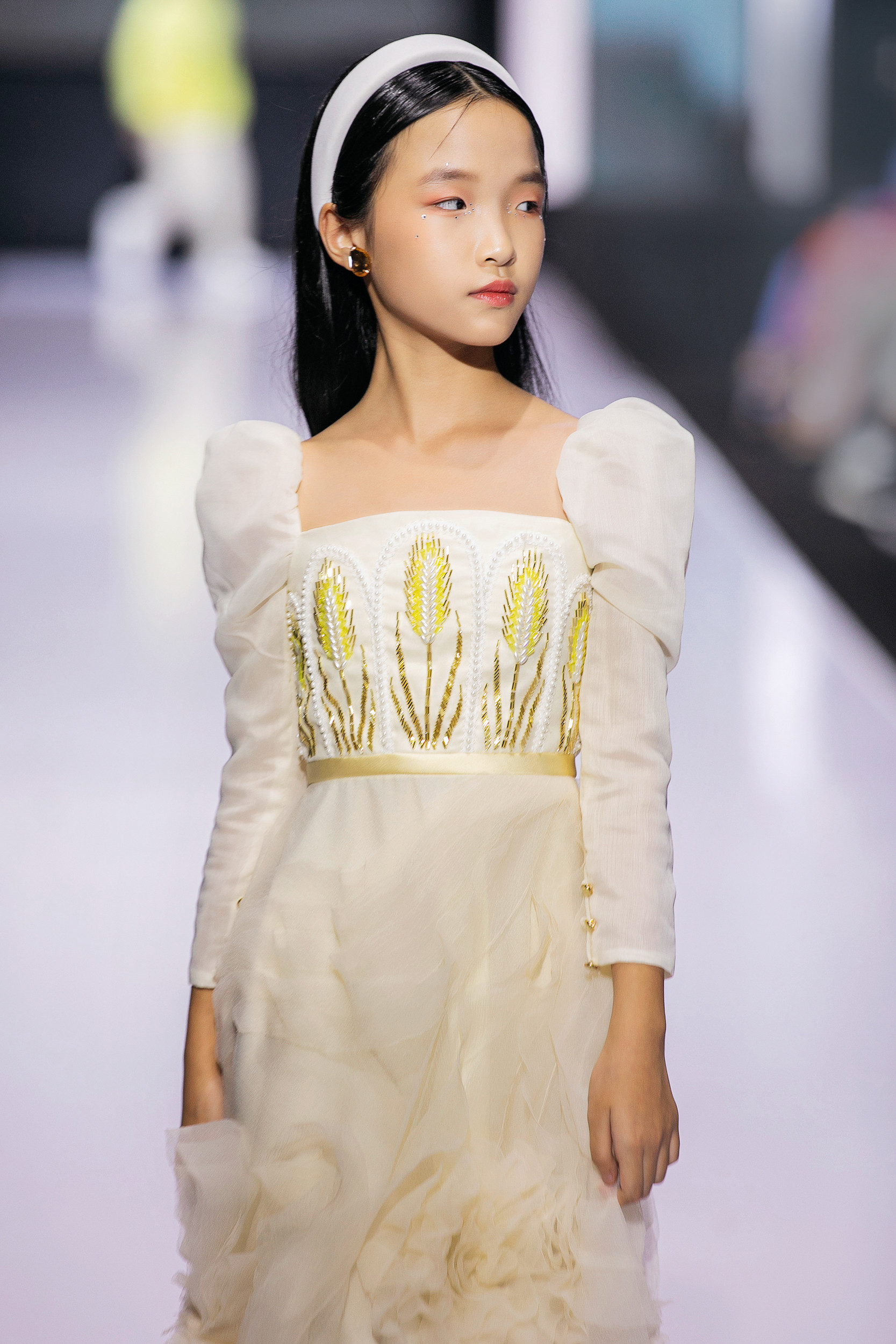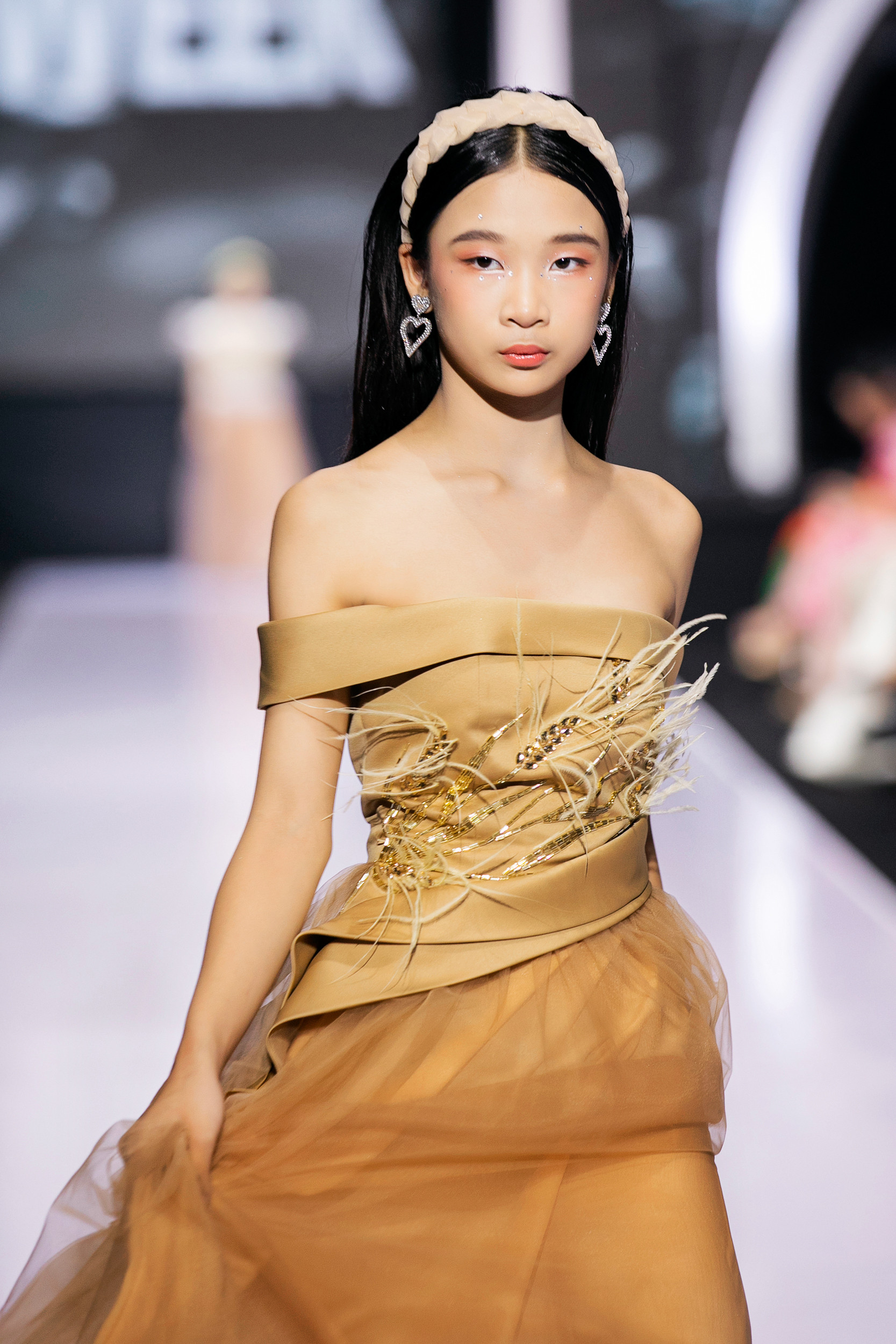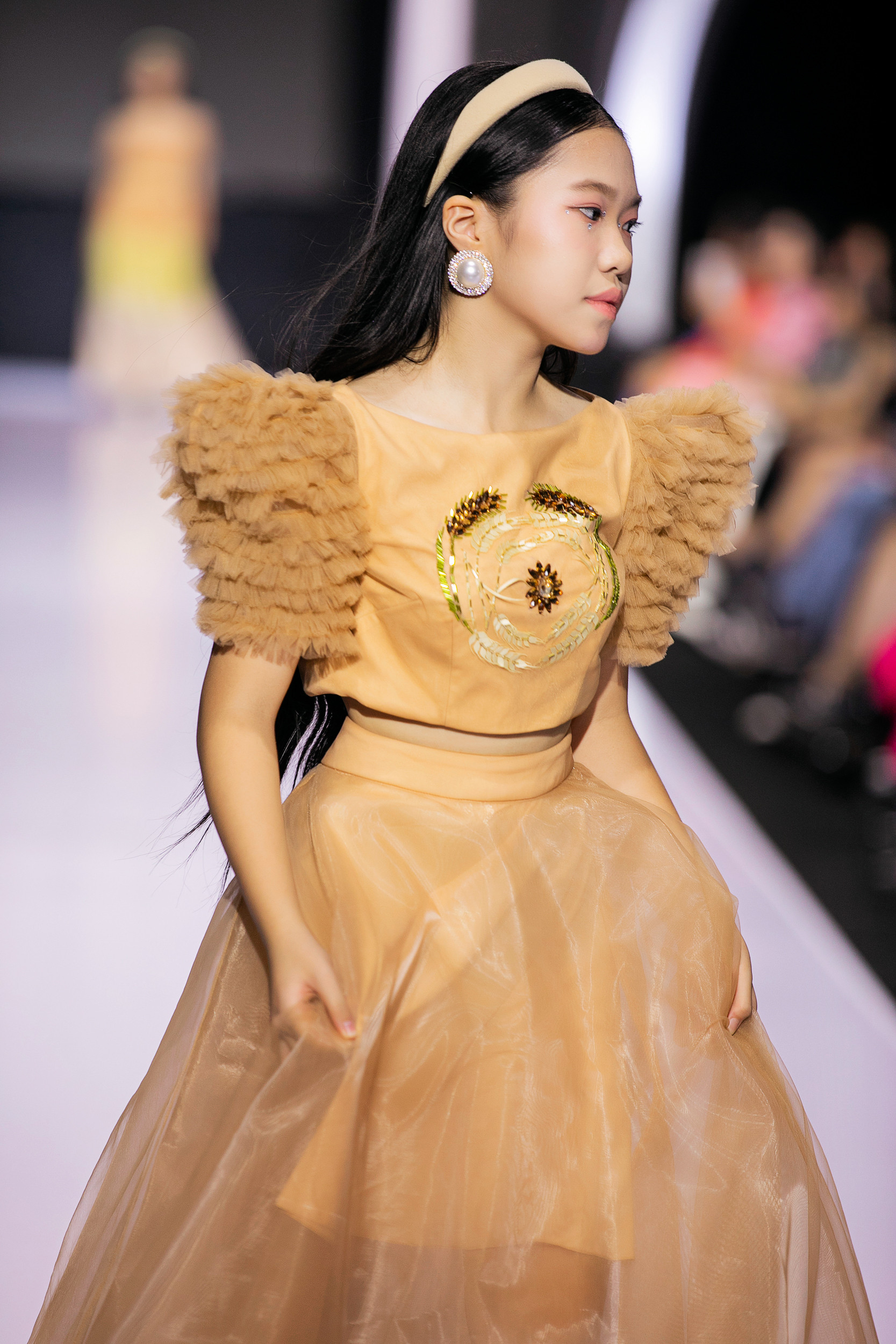 Gần 40 thiết kế được các người mẫu thể hiện sử dụng đa dạng chất liệu như lưới, taffa, lụa hay Organza và gam màu chủ đạo gồm vàng, kem, be, nâu…, đây đều là những gam màu thể hiện hình ảnh bông lúa.